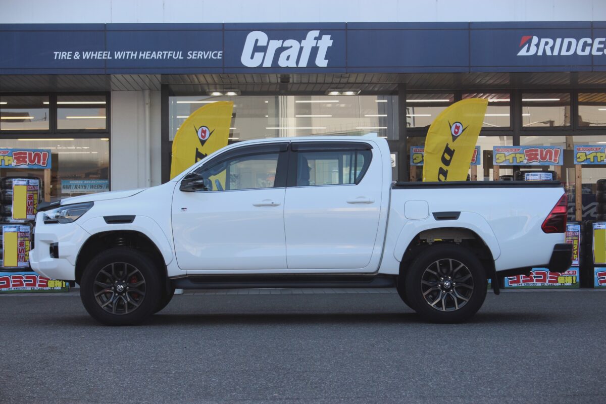 2.0インチアップで普通に見える。。。ちょいアゲ仕様でようやく大きく見える!! ハイラックスGRスポーツのカスタムはクラフト厚木店にお任せ下さいっ✨     いつもありがとうございます、クラフト厚木店・佐藤です!!   本日は 「 ハイラックスGRスポーツ 」 のカスタムをご紹介しますねっ✨   ハイラックスのカスタムを検討中の皆様、リフトアップ量はどの位を考えていますか?? 👀   上の画像を見ていただいても分かりますが、バランス良く仕上がっていますよね!?   当店で行うリフトアップは主に ドレスアップ を目的としたリフトアップが多いかも知れません。   っと言うのも、オーナー様にリフトアップの目的を伺うと、ほとんどのオーナー様が ” ドレスアップを目的としている ” とお答えいただくからです。     この様に、ゴツゴツとしたタイヤを装着し 「 いかにもオフロードを走りますっ 👍 」 って感じの見た目に仕上げる事が目的と言う訳ですよね!!   でも、カッコ良く仕上がった愛車に乗るのってとっても楽しいですし、テンションも⤴ ⤴ ますのでオフロードを走る事が目的でなくても良い訳です。笑   逆に、オフロードを走る事が目的であったり、本場アメリカで走ってそうなもの凄いリフトアップ量に仕上げるのもアリだと思います!!   ですが、ココは日本。   アメリカとは違い車検と言う物がありますので、やり過ぎるとその後の手続きが色々と面倒になる事も。。。   そんな意味では本日施工したハイラックスGRスポーツは良い手本になるのではないでしょうか!?     GUN125系のハイラックスは前期も後期も、そしてGRスポーツと、どのモデルも前下がりに見えてしまうおクルマですよね!?   そんな事からフロントの車高をアゲる事で見た目が大きく変わり、カッコ良いハイラックスに仕上がってくれるんですっ 👍   上の画像を見てもそのバランスの良さがうかがえますよね?? 👀   そんなリフトアップですが、実際にはどの位のリフトアップ量が望ましいのでしょうか。。。   1.5インチ?? 2.0インチ?? それともそれ以上??     ちなみに、本日ご紹介のハイラックスGRスポーツのリフトアップ量は 「 ちょいアゲ仕様 」 となります!!   1.5インチや2.0インチと言うのは理解出来ると思いますが、ちょいアゲ仕様って何でしょうかね!?   そう思った皆様、ちょいアゲ仕様とはワタクシ佐藤が命名したクラフト厚木店オリジナル仕様の事。笑   ちょいアゲと記載していますが、リフトアップ量は1.5インチや2.0インチを凌ぐ多めのリフトアップ量となります。   始めにも記載しましたが、ハイラックスは前下がりに見えるおクルマなので、2.0インチ程のリフトアップを行ってようやく 普通 に見えるんです。   そして2.0インチ程のリフトアップ量の場合、干渉を考えると装着出来るタイヤサイズは 「 265/70-17 」 辺りになるでしょう。     ですが、本日装着しているタイヤサイズは 「 275/70-17 」 となりま~す✨   タイヤとボディーが干渉しやすいハイラックスですが、リフトアップ量やホイールサイズを厳選する事で大きなタイヤサイズを装着する事が出来るんですよぉ~ 👍   この位のリフトアップ量に275と言う大きなタイヤを組合わせる事で、ハイラックスがけっこう大きくなったように見えてくれます。   これが カスタムの効果 なんすよねっ✨   ちなみに、本日のリフトアップ量(ちょいアゲ仕様)は リフトアップスペーサーやリフトアップスプリング では叶わないリフトアップ量となります。     本日ご紹介のハイラックスGRスポーツに装着しているリフトアップKITは オフロードメーカー 「JAOS 」 さんがリリースしているアイテムで「 BATTLEZ リフトアップセット VFCA Ver.A 」 となります!!   リフトアップスペーサーでもなく、リフトアップスプリングでもない 「 車高調整が可能なKIT 」 となっています 👍   その車高調整機能をうまく操る事でこのようにカッコ良いハイラックスに仕上げる事が出来る訳です。   それではノーマル車高とカスタム後のハイラックスを比べてみましょう!!     一目瞭然かも知れませんが、左が入庫時のハイラックスで右がカスタム後のハイラックスです。   前傾姿勢に見えるノーマルハイラックスが見事に変身していますよねっ✨   ちょいアゲ仕様と言う多めのリフトアップを行っていますが、やり過ぎ感はないですよね!?   このさりげなくデカく見えているところが皆様から多くのオーダーをいただいている理由ではないでしょうか。。。       それと、ハイラックスGRスポーツは ワイドフェンダー を装着しています!!   なので、通常のハイラックスに装着するホイールサイズと同じサイズを選ぶとホイールが引っ込んでしまうんですよね。。。   当然、本日装着しているホイールサイズはその辺も考慮したホイールサイズとなっていますよぉ~ 👍   ■ 装着ホイール:RAYS TEAM DAYTONA D108 8.0J-17インチ   いかがでしょう、右側のハイラックスはタイヤがボディー外側まで張り