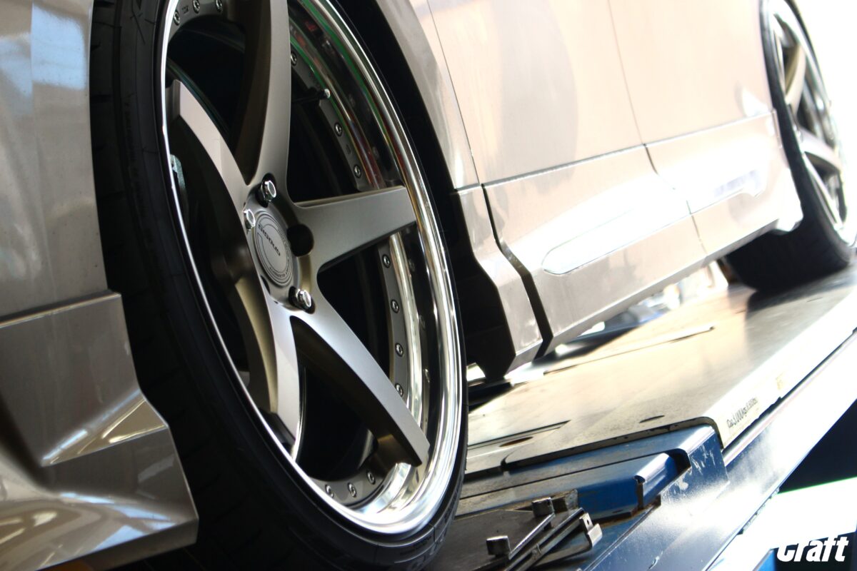 40系アルファードの足元に前後9.5Jを入れ込む!! リヤにはなんとクラフトで初のインセット20台をインストール。 ツライチを追い求めた渾身の一台をご紹介。 クラフト知立店金子です。 いつも当店をご利用頂いている常連様の40系アルファード。 オーナー様と私の想いが詰まった一台に仕上がりました。 今回のカスタムプランは 前後9.5J幅のホイールを装着してツライチに仕上げるプラン。 インナー側がタイトな車両の為、今回は【ブリッツ ZZ-R】のセレクト。 ショック外径とロックシート径が細く 9.5Jの極太ホイールをインストール出来るようなアイテムをセレクト。 上記のJ数のホイール幅を入れ込む為には車高調のアイテムセレクトも非常に重要です。 車高調以外に諸々パーツを同時に取付し、アライメントの施工まで終了。 あとは実車測定を行い、あとは9.5Jのホイールでどこまで攻めれるのか インナークリアランスが確保出来ているかを計算。 事前にメーカーに部材は抑えて頂いているので、 打ち合わせを行った上でインセットをオーダー。 とりあえずはここまででプラン1日目は終了。 1~2週間後にはホイールが到着!! オーダー頂いたのはWORK ジースト STX 21インチ 前後9.5Jのディープコンケイブディスク。 インセットは前後で変更しており、リヤ側にはクラフトで初のインセット20台を 入れ込んでイキマス!! ディスクカラーはブラッシュド リムカラーはオプション設定となるブロンズアルマイトをセレクト。 前後同じディスクで同じJ数だとしても、 前後のインセットが異なりますので、スポークの立ち上がり箇所が変わります。 溶接2ピースホイールだからこそ、mm単位でインセットがオーダー出来ます。 タイヤはヨコハマ デシベル V553(245/40R21)をセレクト。 9.5Jのホイール幅に対してV553は過度な引っ張りにはならず。 リムガード部分とアウターリムエンドが丁度ツラになる仕様となります。 ホイールを大きくする事で、タイヤの肉厚は薄くなり それに伴いロードノイズが響きやすくなりますが 静粛性能に長けたタイヤを使用する事で、可能な限り相殺していきます。 ホイールナットはモノリス T1/07 ネオクロを使用し センター付近に彩を与えます。 センターキャップをシルバーにする事で、色鮮やかなホイールナットとケンカせず 配色もかなり考えた仕様になっております。 (ノーマル状態) (ローダウン状態+純正ホイール) (ローダウン+ジーストSTX 21インチ) WHEEL:WORK ジースト STX SIZE:9.5J-21インチ (前後インセット違い)5H-120 TIRE:ヨコハマ デシベル V553 SIZE:245/40R21 WHEEL NUT:モノリス T1/07 ネオクロ SUSPENSION:BLITZ ZZ-R(ブリッツ ダブルゼットアール) OPTION:キャンバーボルトなど インナークリアランスが非常にタイトな40系アルファード、ヴェルファイアに 9.5Jのホイールを入れ込むとなると、インセットは攻めていくのがマスト。 あまり過度な仕様には・・・という方には、9.0Jくらいまでがベストでしょう。 ただ単に車高調を入れただけでは、この仕様の再現は不可能です。 前後ディープコンケイブを入れ込んだ事で、 このアングルだとセンター部は見えません。 それだけ中心に深く落ち込んでおります。 リムがステップリムの為、21インチのリムにディスクは20インチを使用しております。 ジーストSTXはスポークの立ち上がりがオーバーラップしているという点。 そしてディスクカラーをブラッシュドで膨張色を使用している点を含め、 ディスクが20インチだからといってホイールが小さく感じるというのもありません。 今回クラフトで初のインセット20台カスタム。 数ミリのリム深度の違いで与える印象は変わってきます。 それを分かっているからこそオーナー様が拘った答えの「前後インセット違い」 拘りを感じずにはいられない仕様に。 オーナー様、いつもクラフト知立店のご利用、誠に有難う御座います!!   管理番号:0082506291007 ■現在開催中キャンペーン ■今月のイベント