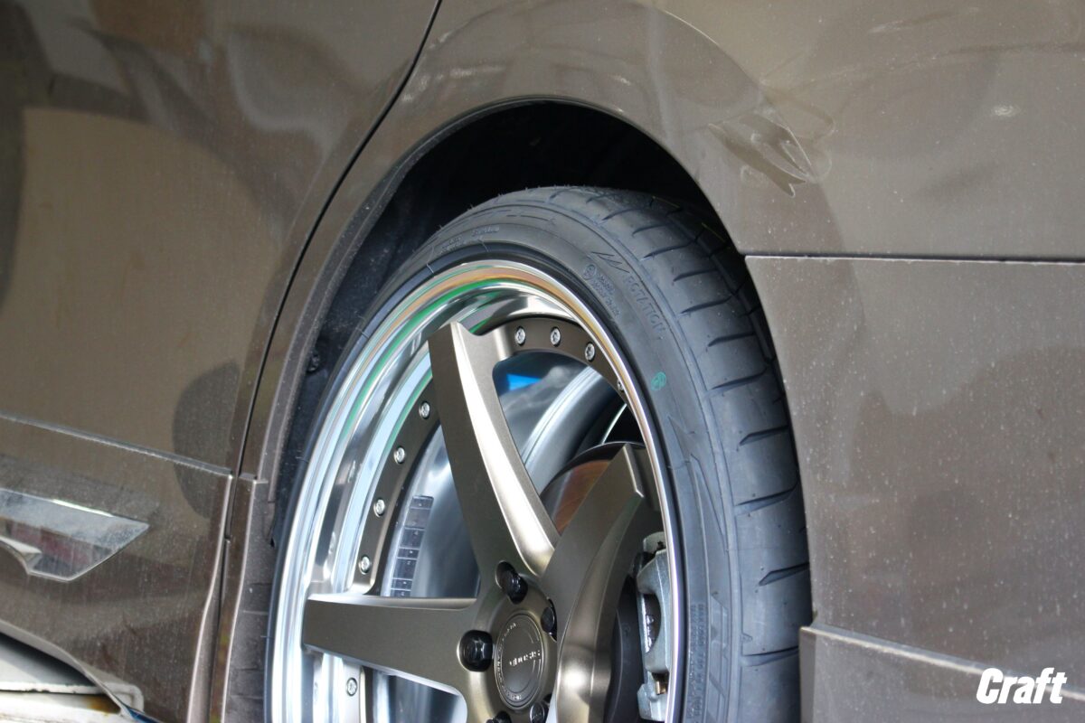 HKS車高調でローダウンを行いディープコンケイブを履く。 キャンバー調整も行い前後9.5Jを装着しましたよぉ~✨     いつもありがとうございます、クラフト厚木店・佐藤です!!   本日のご紹介はH様・40アルファード。   人気のコンケイブホイールでカッコ良く仕上げましたよぉ~♬♬     先日、HKS車高調を装着しローダウンを行ったおクルマですが、今回はタイヤ・ホイール交換を行いました!!   もちろん、サイズはピッタリツライチ仕様っ✨️   そんな仕様を実現出来るのも、オーダーインセットが可能な2ピースホイールだから!!   もちろん当店で持ち合わせているノウハウも織り交ぜながらのカスタムなので、普通にホイールを交換するだけでは上手くいきませんのでご注意下さいね!!     ご購入いただいたホイールは 「 WORK ジースト STX 21インチ 」   ホイールサイズはツライチサイズでのオーダーとなりますが、リム幅は前後9.5J&前後同一インセット でオーダーしています!!   通常のホイール交換の場合、前後同一インセットですと下記の問題が発生します。   ・フロントに合わせた4本の場合、リアが引っ込んでしまう。 ・リアに合わせた4本の場合、フロントが突出してしまう。    このどちらかが犠牲になってしまうと言う部分をどうにかしたいと考える訳です。     ですが 「 リアが引っ込んだらスペーサーを入れる 」 っと言った簡単な対処法は使いません。   スペーサーはナットの掛かりが少なくなってしまうので、出来る事なら使いたくないパーツですからね。   そうなると次に考えるのはリアに合わせたサイズを装着した際のフロント突出を抑える事が出来ないかって事になりますよね!?     「 突出を抑える=キャンバーをつける 」 っと言う事になります。   しかし、先日装着したHKS車高調はキャンバー調整が出来るピロアッパーマウント仕様にはなっていません。   ですが、アフターパーツで多少のキャンバー調整が出来るアイテムならリリースされています。   今回はそんな追加パーツを使いながらディープコンケイブのジーストSTXを装着したんですよぉ〜🎵🎵     こうして見てもとてもスタイリッシュに仕上がっていますよねっ✨️   ちなみに、本日装着しているホイールカラーはブラッシュド。   ブラッシュドはシルバーっぽい色味に見えますが、通常のシルバーとは全くの別物。   ブラッシュドとはディスク面に細かいヘアライン加工を施した仕様。   なので光を受けた時の輝きが独特で、通常の塗装品とは違った高級感ある輝きを魅せるんです!!   皆様の愛車にもブラッシュドカラーを装着してみてはいかがでしょうか??     それでは最後に出ヅラをチェックしてみましょう。     いかがでしょうか!?   ピッタリツライチ仕様に仕上がっていますよねっ✨️   オーダーインセットが可能な2ピースホイールであればオーナー様の理想の仕上がりを実現しやすいですよっ 👍️   ツライチカスタムの事ならクラフト厚木店までぜひご相談下さ〜い🎵🎵     H様、いつもご利用誠にありがとうございます!!   拘りの車高調に続き、拘りのホイール交換も完成しましたねっ✨️   車高調を取り付ける際にこの日の事を想定したセッティングを行いましたが、上手く行きましたね!!   カッコ良く仕上がった愛車でドライブをお楽しみ下さいね、それではまたのご利用お待ちしておりま〜す☆☆