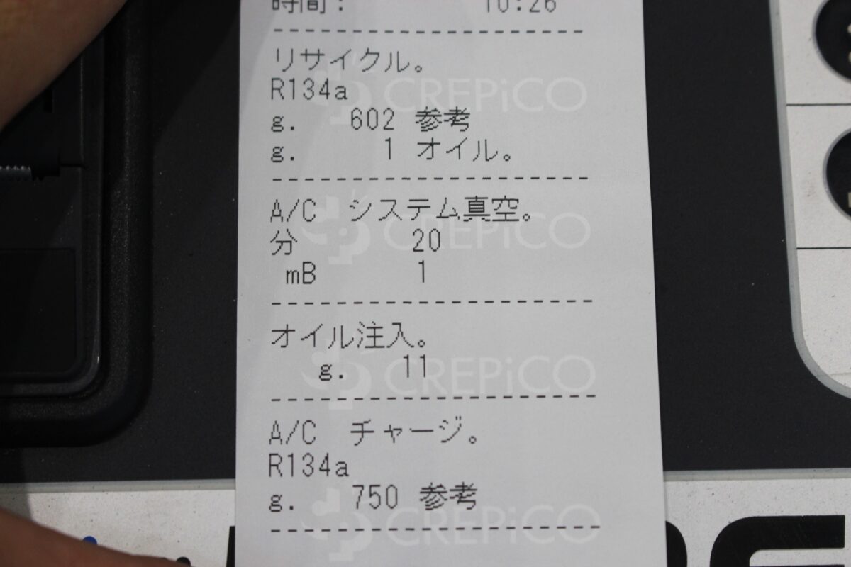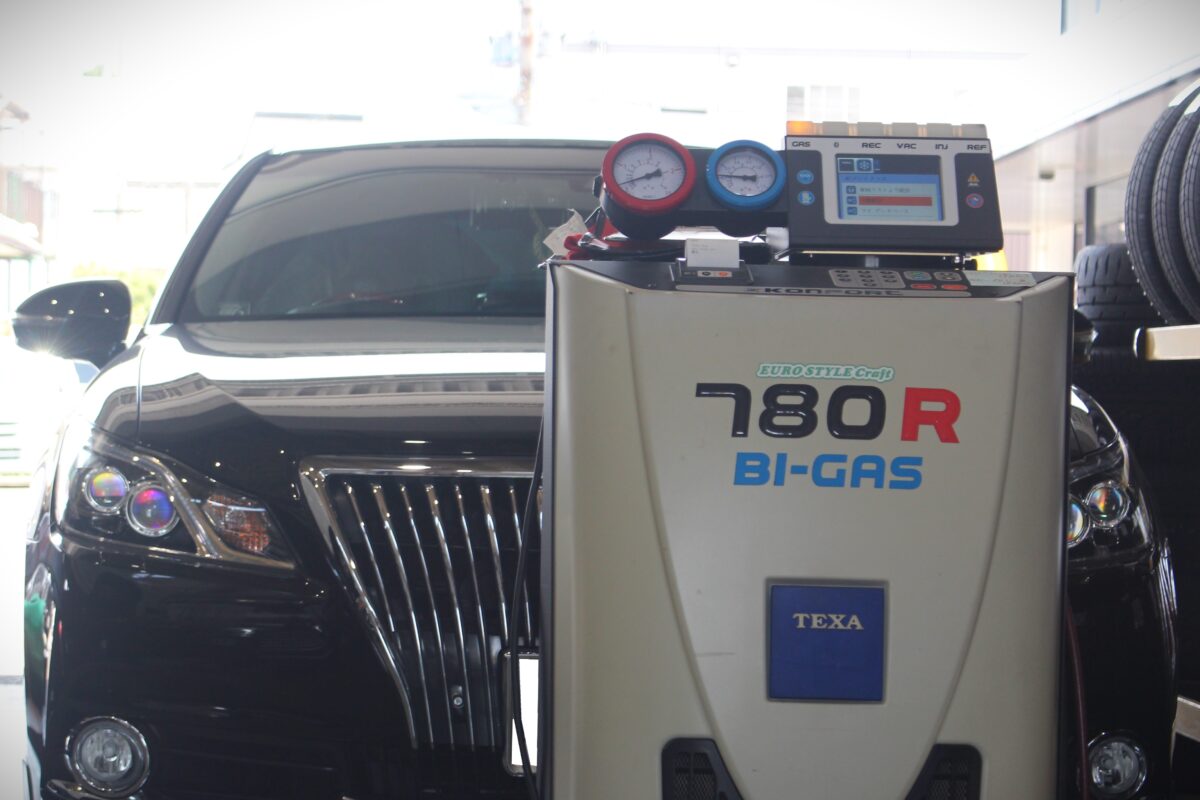 車両情報をエアコンガスメンテナンスマシーン”TEXA-テクサ-KONFORT 780R”へ設定後、車両の残っているガスを回収→ガス回路の漏れ確認→規定量のガス・オイルの充填を行います。