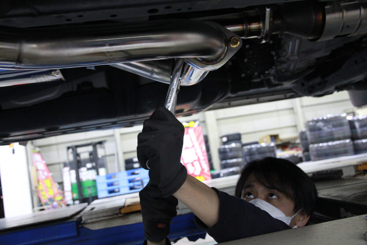 マフラーハンガーを設置出来るように付属ステーを取り付けていきます。