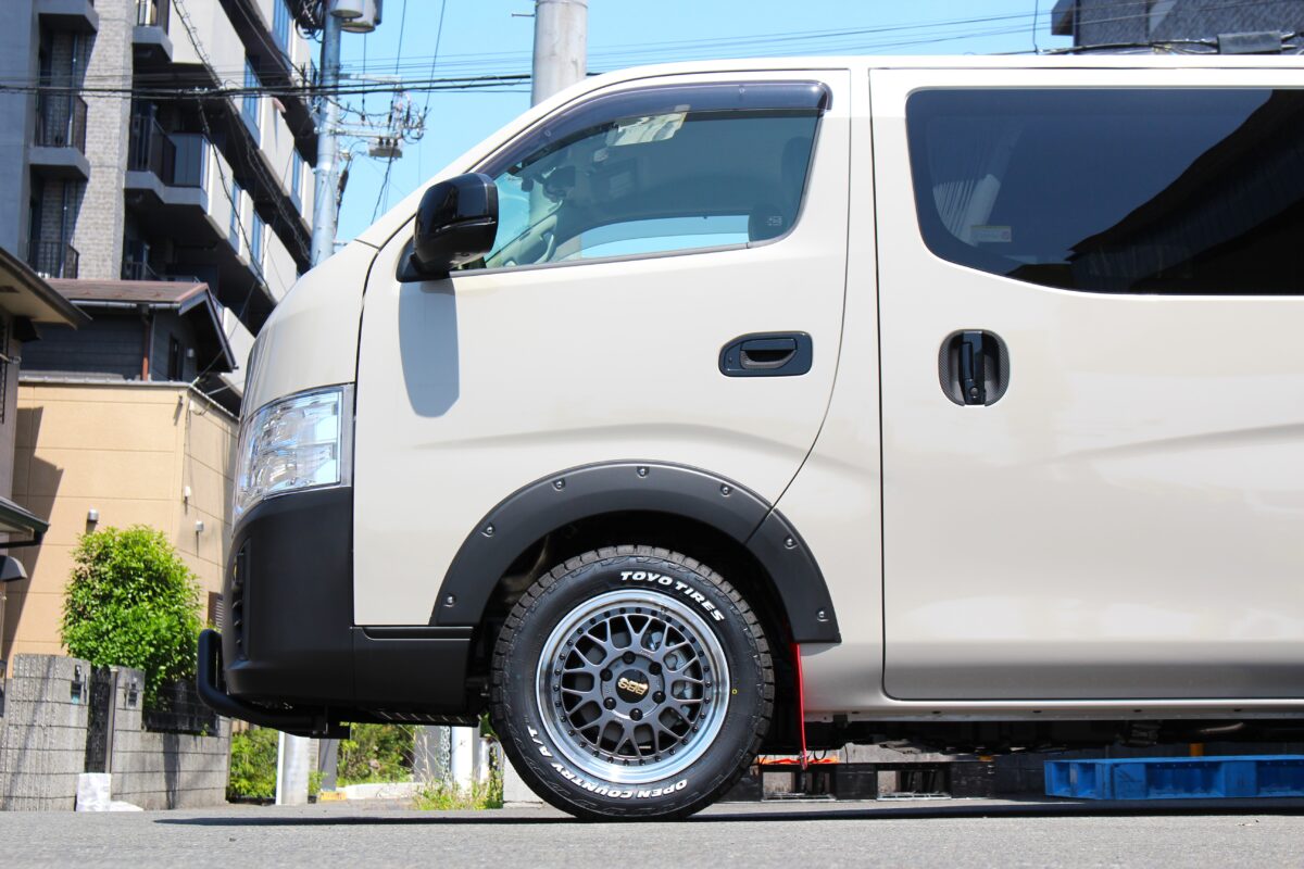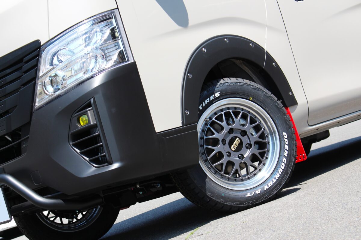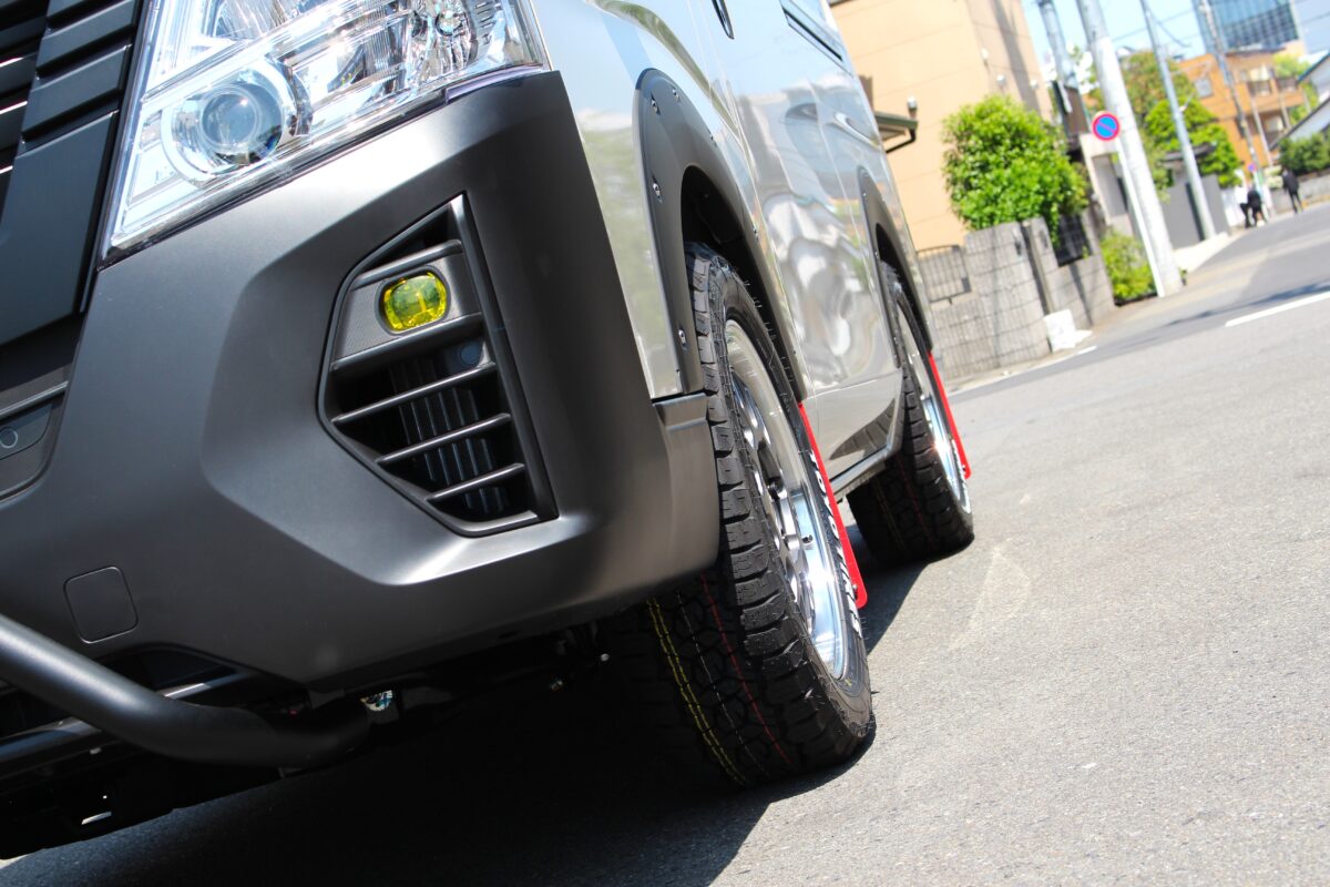 ハイエース用ホイールを取付すると少しはみ出気味になってしまいますが