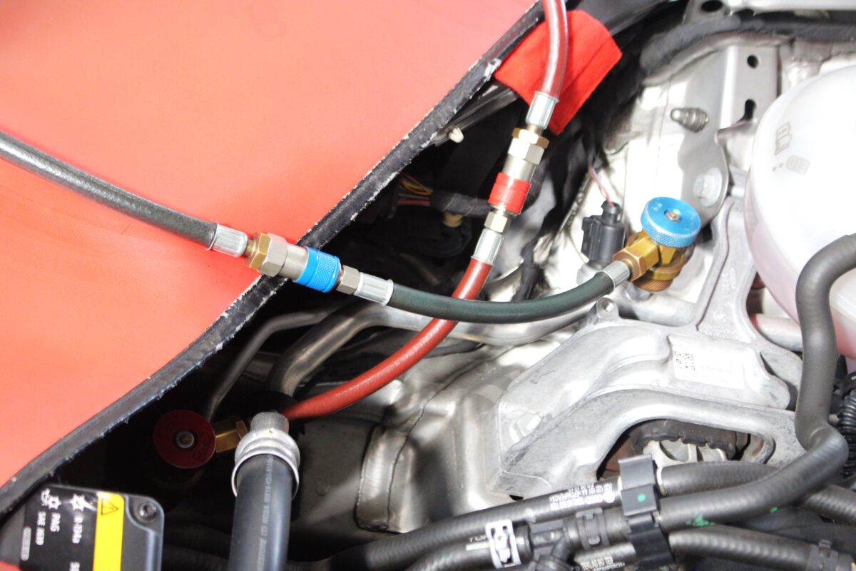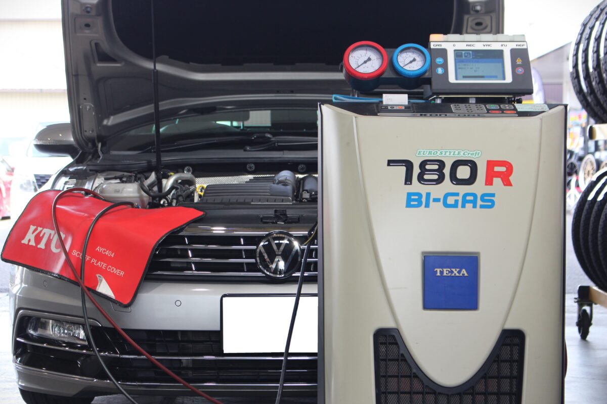ガスとオイルの種類を確認後エアコンメンテナンスマシン”TEXA-テクサ-”に接続してガス量を適切にメンテナンス