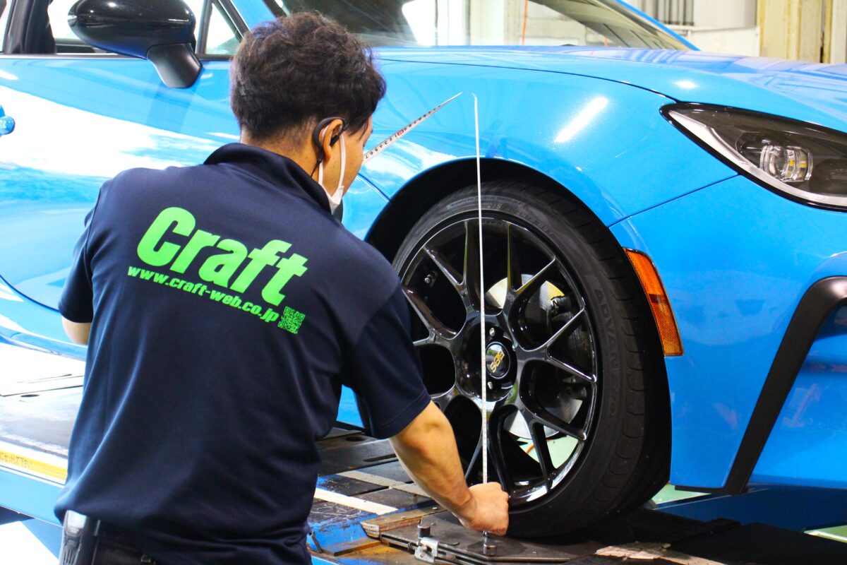 各部測定し、希望車高にセットされたら仕上げのアライメント作業へ。