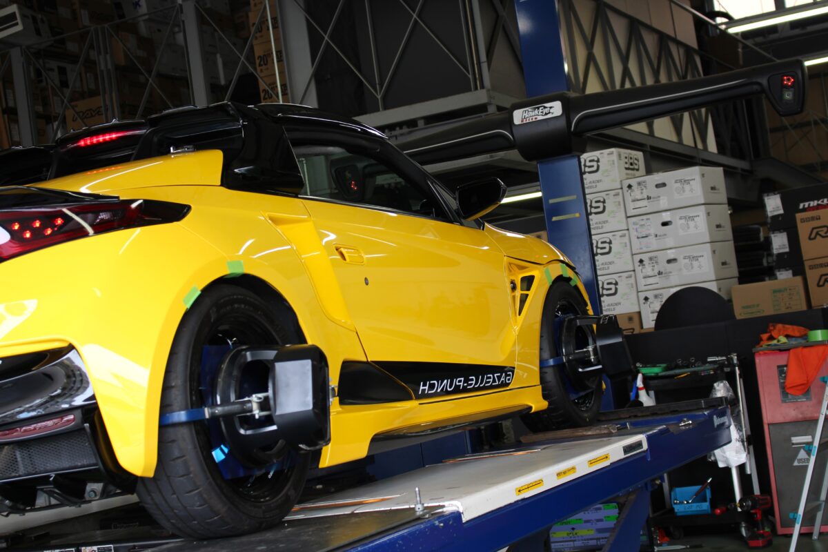 フェンダーから糸を垂らし、オーナー様と確認しながらアライメントが完了。