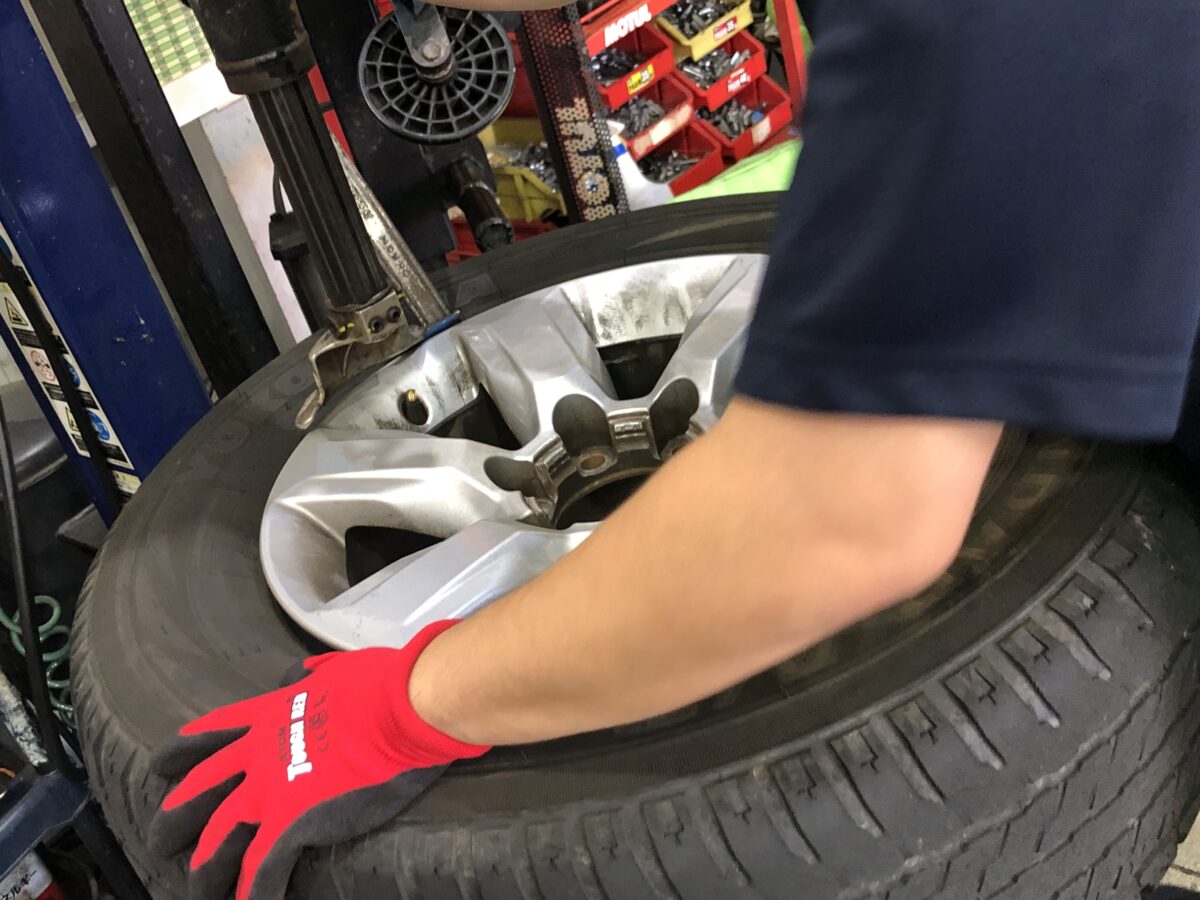 車両からタイヤホイールを取り外し、