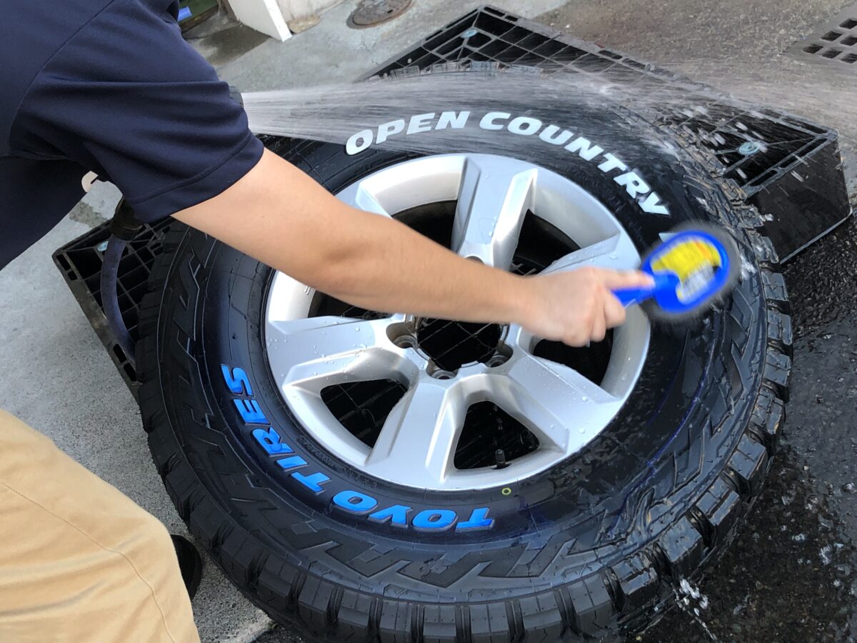 タイヤを組み付けてバランスをとった後に青い保護剤をおとすために洗浄します。