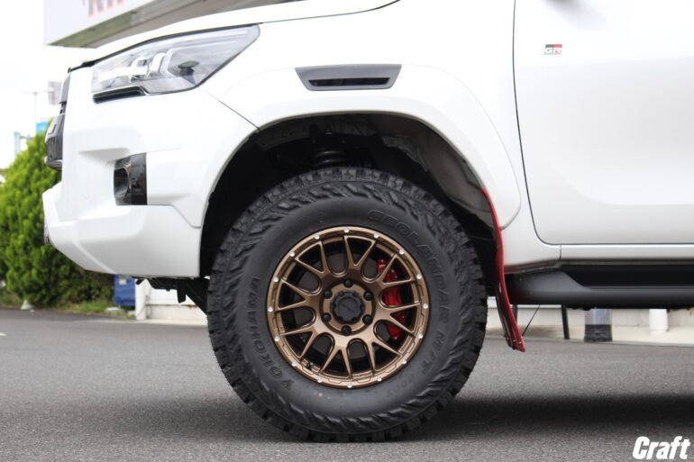 今回の場合タイヤサイズは275/70-17を装着しており、今回のリフトアップ量だとギリギリ擦れるかどうか。