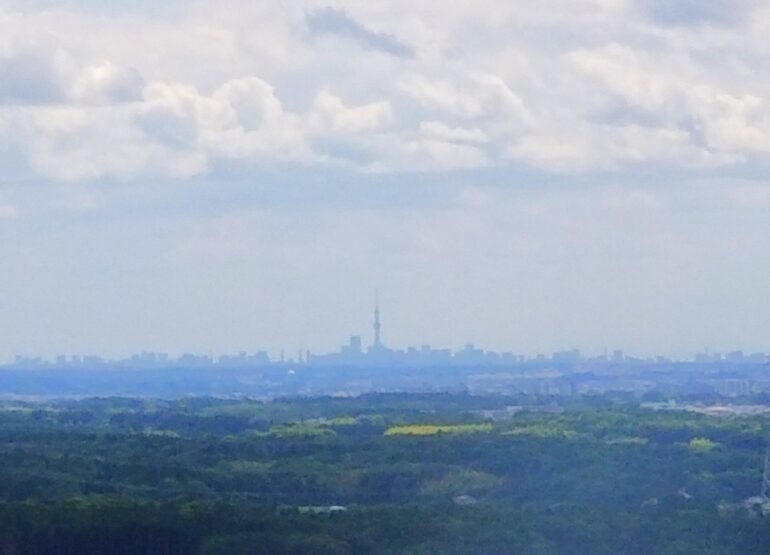 向こうに見えている山はきっと 筑波山 でしょうかね。
