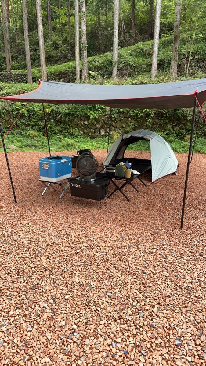 日陰とは言えやっぱり暑かったです(-_-;)、私の代名詞でもあるタンクトップで設営しましたが汗だくです💦