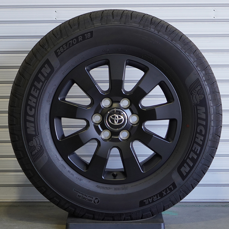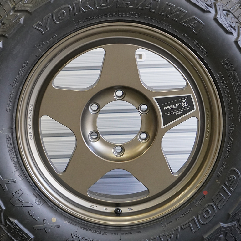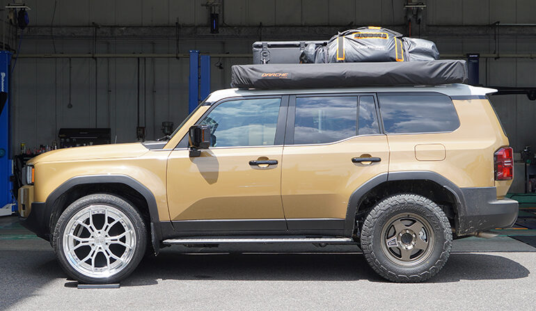 車高はノーマルですが、純正タイヤサイズが265/70R18であるのに対し、写真のデモカーは275/70R18のタイヤを、ブラッドレー・フォージド匠とともにを装着しています。