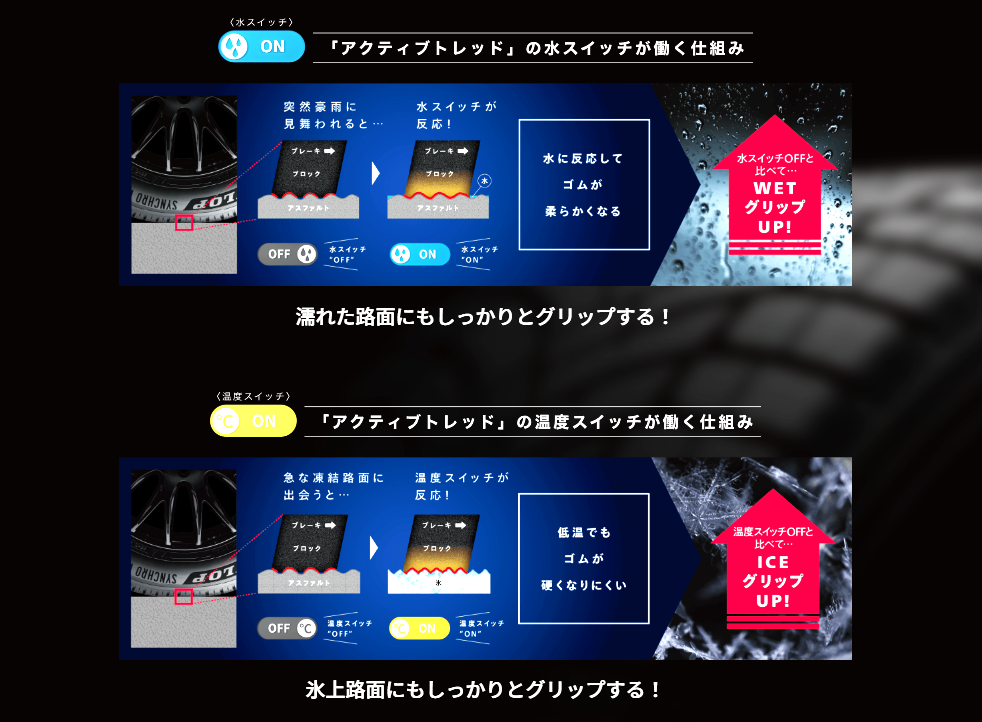 最大の特徴として路面状態に合わせてタイヤ自らが適した性能に変化する