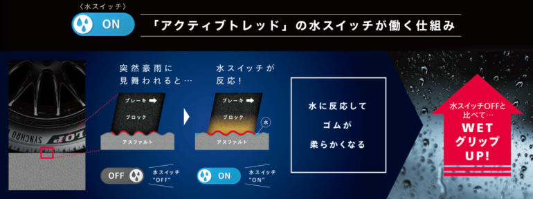 雨が降った場合、水に触れた時だけゴムが柔らかくなりウェットグリップ性能を発揮します。