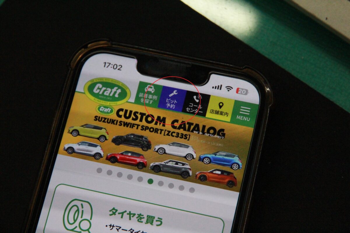ホームページを開いたら 赤い〇を付けた部分に「ピット予約」というものがあります。