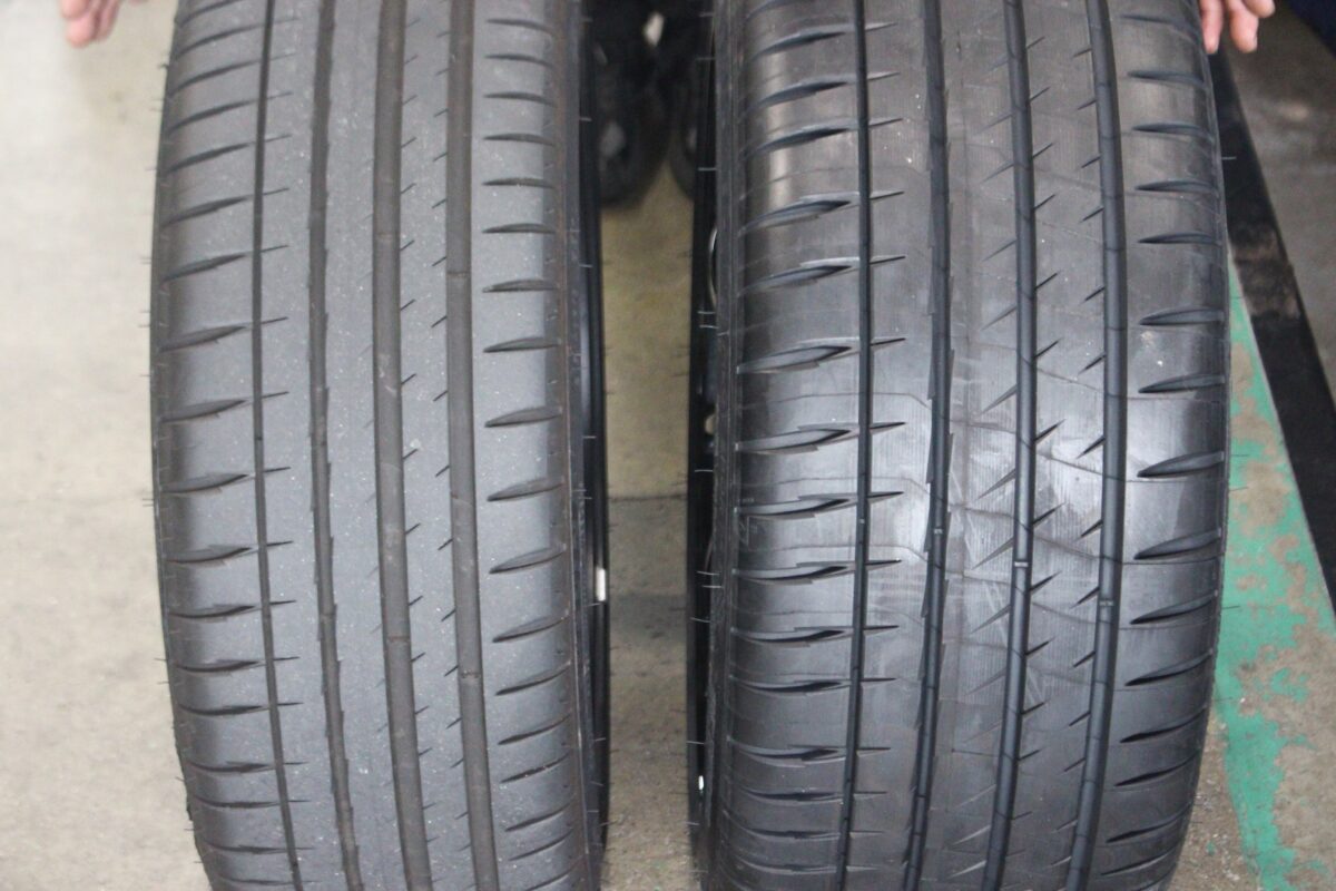 左は純正タイヤの「215/40R18」、右が本日取り付ける「255/35R18」パッと見でもかなりワイドになっています。