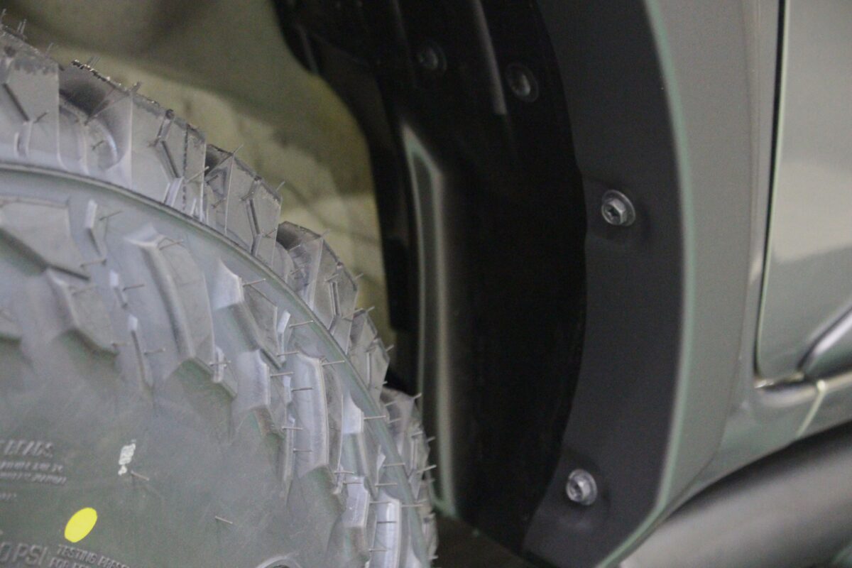 純正のマッドフラップを外し、純正フェンダーの加工も行います。