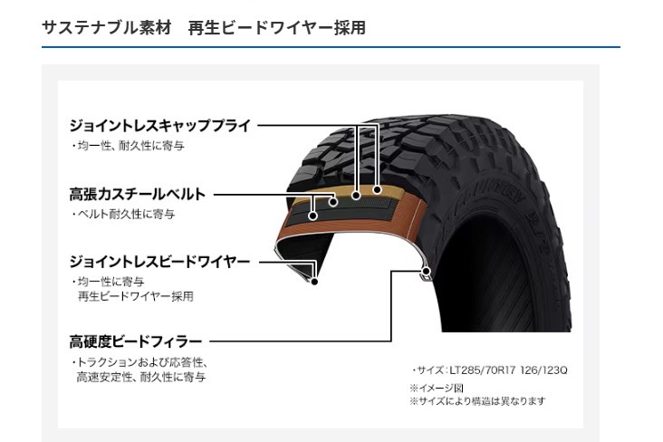 再生ビードワイヤーを採用とサステナブルな素材を使用