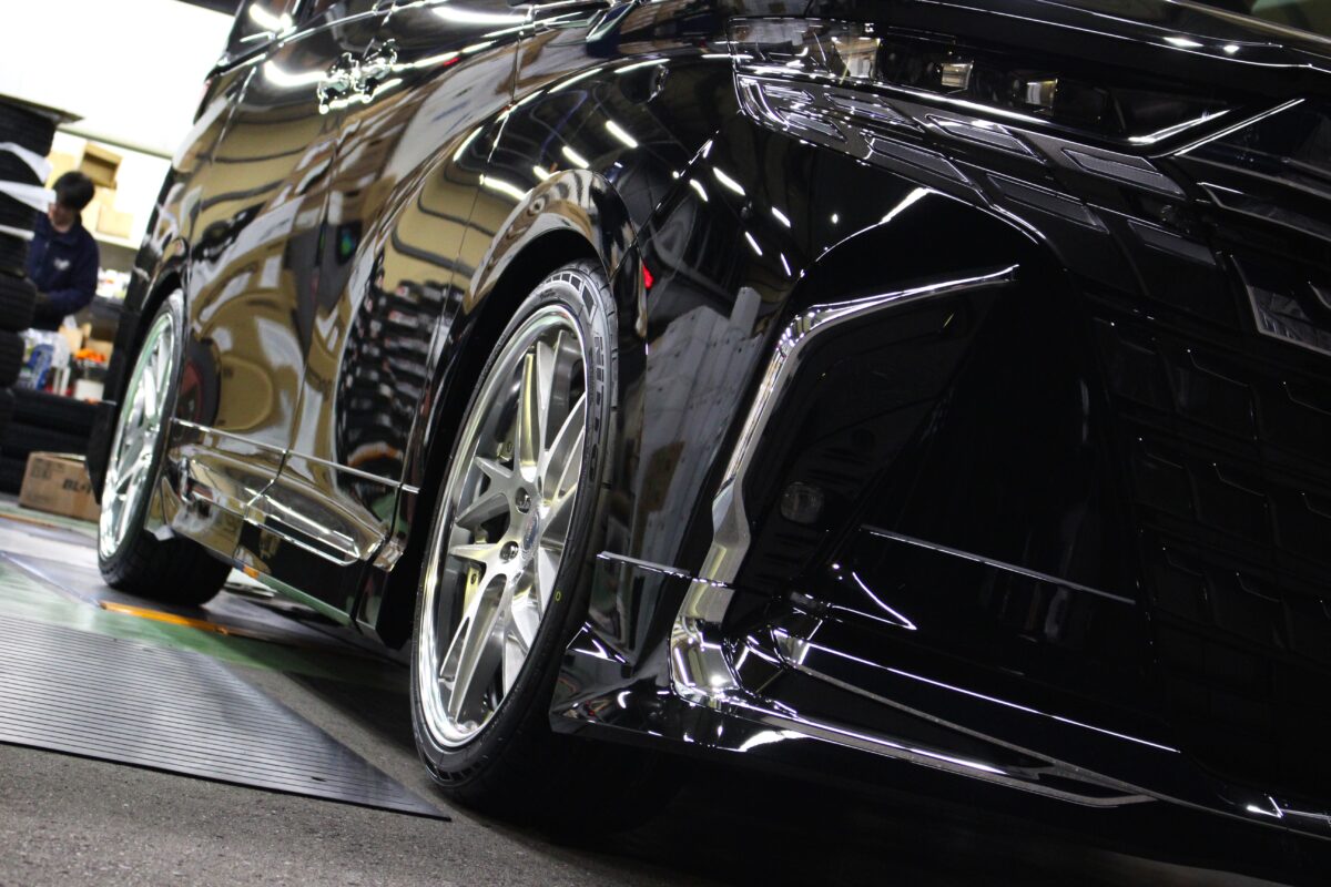 こちらのお車には車高調でのローダウンと大口径21インチホイールを装着となります♪