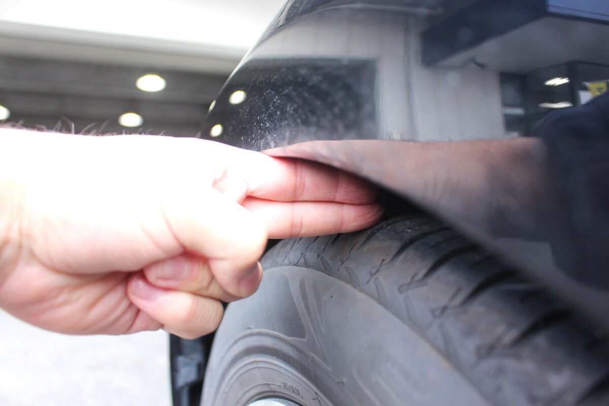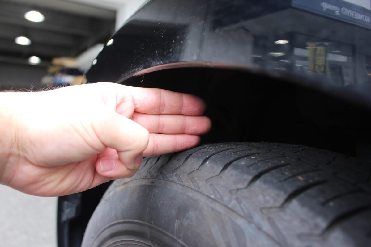 装着前のタイヤ~フェンダー間は指3.5本分ほどのクリアランス