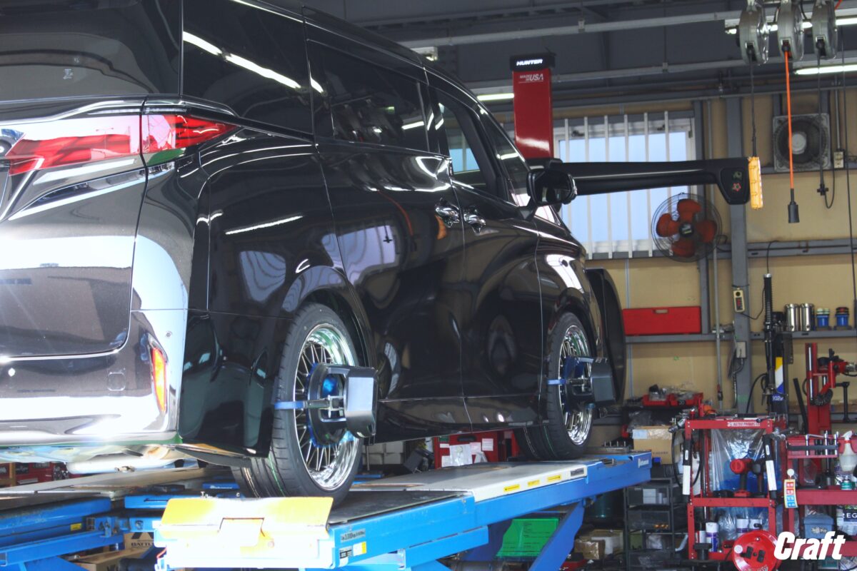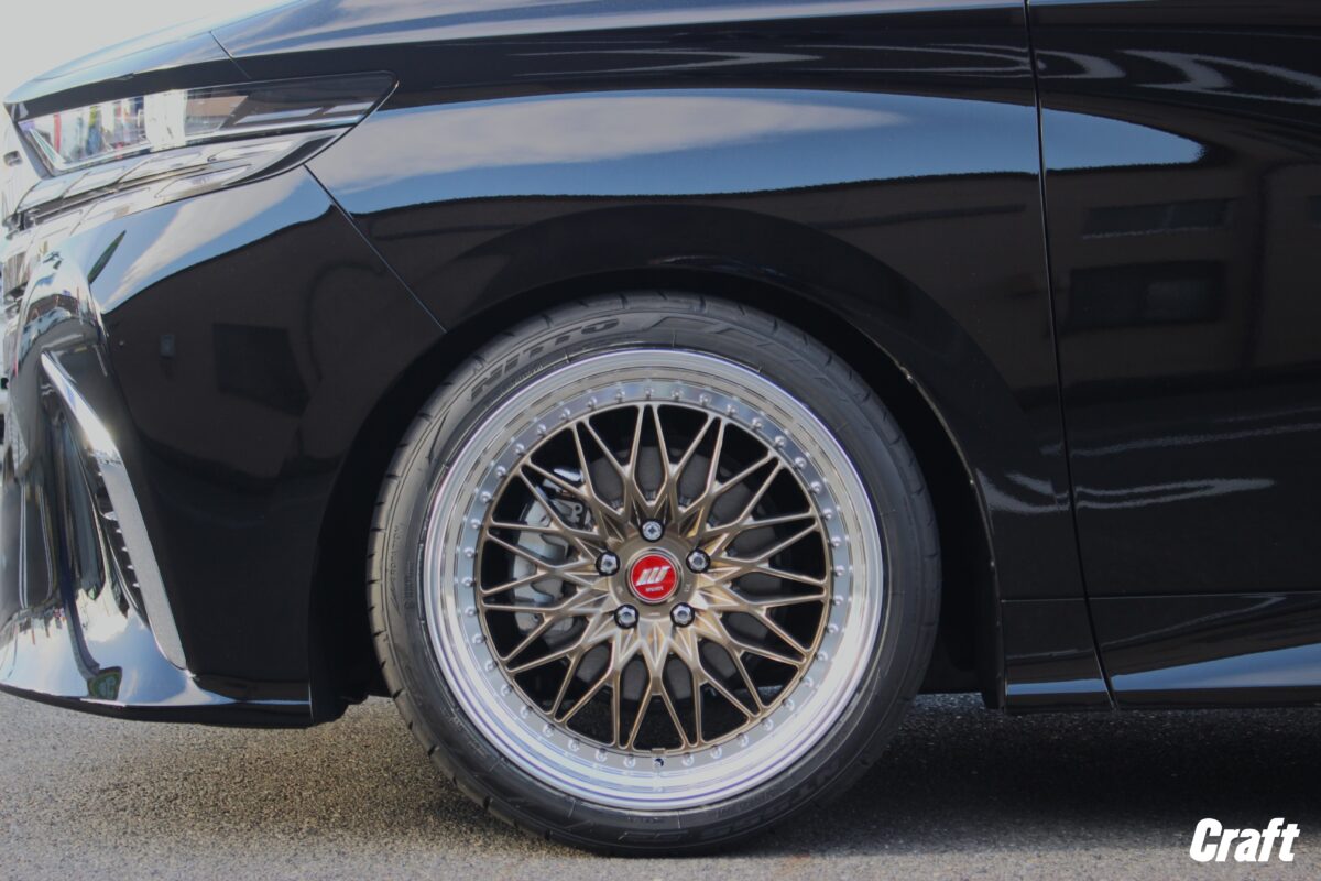 いつもありがとうございます!!クラフト厚木店・のりかずです。   本日ご紹介するのはI様・30ヴェルファイアのタイヤ・ホイール交換!!   なんと埼玉からご来店いただいたんですよ~!   遠方からのご来店ありがとうございます!     I様からご相談いただていたのは、ローダウンとタイヤホイールの交換。   ローダウンは以前ブログでもご紹介させていただきましたよ! まだ見ていない方はこちらからどうぞ→【30ヴェルファイア】車高調選び、僕はこんな風に決める。   簡単に前回のブログを振り返っていきましょう!     まずこちらが車高調でローダウンをした状態の一枚。   ダウン量は約70mm。   今回は前後で同サイズのホイールを装着する予定なので、この時点でローダウンだけでなくキャンバーの調整も行っております。     純正の出ヅラはこんな感じ。   フロントは追加でキャンバーを寝かせているので、かなり引っ込んでいますね。   しかし、この前準備のおかげでかっこよく仕上げることができます!     ローダウン後は実車計測で出ヅラの計算をしていきます!   今回の出ヅラは車検・点検等を踏まえての出ヅラ調整。   しかし、車検・点検を踏まえているからと言って、引っ込みすぎるような出ヅラにはいたしませんよ!(笑)     今回ご注文いただいたのは「マーベリック709M」。   深リムを作りやすいホイールで人気だったりもします。   今回チョイスしたサイズは9.5J-21インチ。   ホイールカラーは「グラズブラック」となりますよ!     リム深度もこのようにしっかりとれています!   今回のサイズだとリム深度は約70mmオーバー。   段リムがきれいに仕上がるリム深度ですね♪   それでは早速装着した30ヴェルファイアをご覧ください!     この角度から見るとリムがとても深く見えますね✨   ホイールは9.5Jの太さに対してタイヤは245/35-21と言ったサイズをチョイス。   タイヤの角が少し引っ張る方となるので、しっかり車高が下がっているクルマにはベストな組み合わせですよ!     また、今回はナットにも拘っており、ホイールが黒ならワンポイントで赤を入れることに!   ご用意させていただいたナットは「キョーエイ レーシングコンポジットR40 アイコニックス」。   ちなみにこのナットは頭がキャップになっているので青や黒に変更することもできちゃいます✨   今は赤だけど飽きてきたらキャップだけ追加で購入し交換してあげることもできちゃいます!     では、こちらが全体像ですね。   黒のホイールにワンポイントの赤がいい感じですよね👀     そしてこちらが出ヅラ。   少しだけゆとりを作ってのセッティング!   それでも出ヅラはこのようにいい感じに仕上がってくれますよ👍     マーベリック709Mは2ピースホイールなので、「このサイズがあればいいのに」と言った心配がないので、「この出ヅラにしたい!」と希望があれば仕上げることができちゃいます!   2ピースホイールで仕上げる場合は実車計測で仕上げるとより満足度が大きいですよ~   それでは沢山のご相談お待ちしております!     I様この度はクラフトをご利用いただきありがとうございました!!   遠方から3度のご来店ありがとうございます!!!   3度も来店するのは手間だったと思いますが、より満足できる仕様へとなったのではないでしょうか!!!   また、ぜひクラフトをご利用くださいね✨   それでは楽しいカーライフをお過ごしくださーい!
