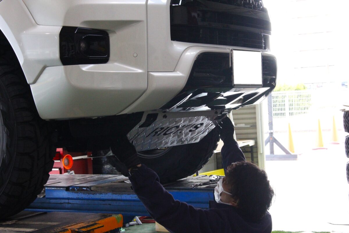 ■RICK'SスキッドプレートでハイラックスGRスポーツを堅牢にする。 一般的な乗用車比で凹凸路面走行機会も多いのがヨンク系車両。 そのような状況下だとはね石や突起物が腹下部に接触する機会も相応にあり不安もつきまといます。 不安解消の一手となるアイテムをご紹介させていただきます。 こんにちは。三重のアーバンオフクラフト鈴鹿店の安藤です。 アーバンオフ仕様な"トヨタ ハイラックスGRスポーツ"が本日の主役。 以前当店にてタイヤ&ホイール、足回り一式施工させていただいた一台です(※おさらいはココから)。 オフ走行中心でなくともソトアソビの機会に荒れた路面走行を行うことも多いのがヨンク。 上述のようにボディ下部に意識が向くことも・・・ その解消のため取付けるのがコチラ ↓ ↓ ↓ ↓ ■RICK'S スキッドプレート ハイラックスをはじめランクル250やプラド等ヨンク車両向け商品を扱うリミテッドチトセ様の一品。 軽量なアルミ製で防錆処理も◎。 中央部に「RICK'S」の大きなロゴがあり、車両前方部からの印象激変も狙えます。 ウレタン塗料ver.の場合、カラー構成は上記ホワイトとレッドの2色。 目を惹く2色なだけに好みに応じての選択で魅せましょうネ。 今回はホワイトをチョイス。 位置を決めながら取付けていき、正確な位置が出たら本締めで完成! 車種に合わせた設計なので、フィッティングも◎。 WHEEL:RAYS TEAM DAYTONA M9+ 17in TIRE:トーヨータイヤ オープンカントリーR/T SUS:4x4ES カントリーサスペンションキット OP:RICK'S スキッドプレート(ホワイト) 【BEFORE】 【AFTER】 BEFORE→AFTERでは一目瞭然の差。 見ためだけでなく、凹凸路面走行時における突起物やはね石からの防御力もUP! オフシーンでの不安解消に効きますネ。 【FRONT】 真正面も◎ GRグレードの特別性にプラスしてカスタム感向上! 印象を大きく変えるパーツが多いのもヨンクの特権。 アレコレと拘り、唯一無二な一台を作りましょうネ! この度も当店のご用命誠にありがとうございました! リミテッドチトセ商品のお問い合わせも当店まで。 それでは素敵な4x4ライフを! アーバンオフクラフト鈴鹿店でした!