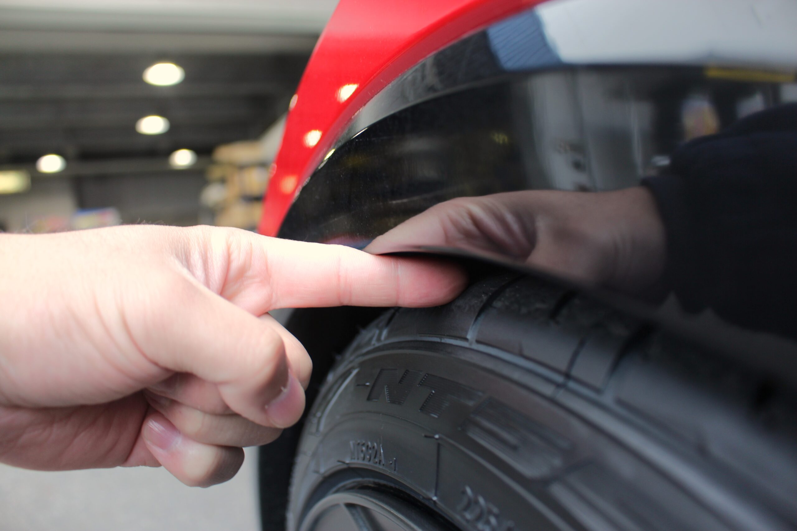 純正状態のフェンダークリアランスはご覧の通り指3本分。