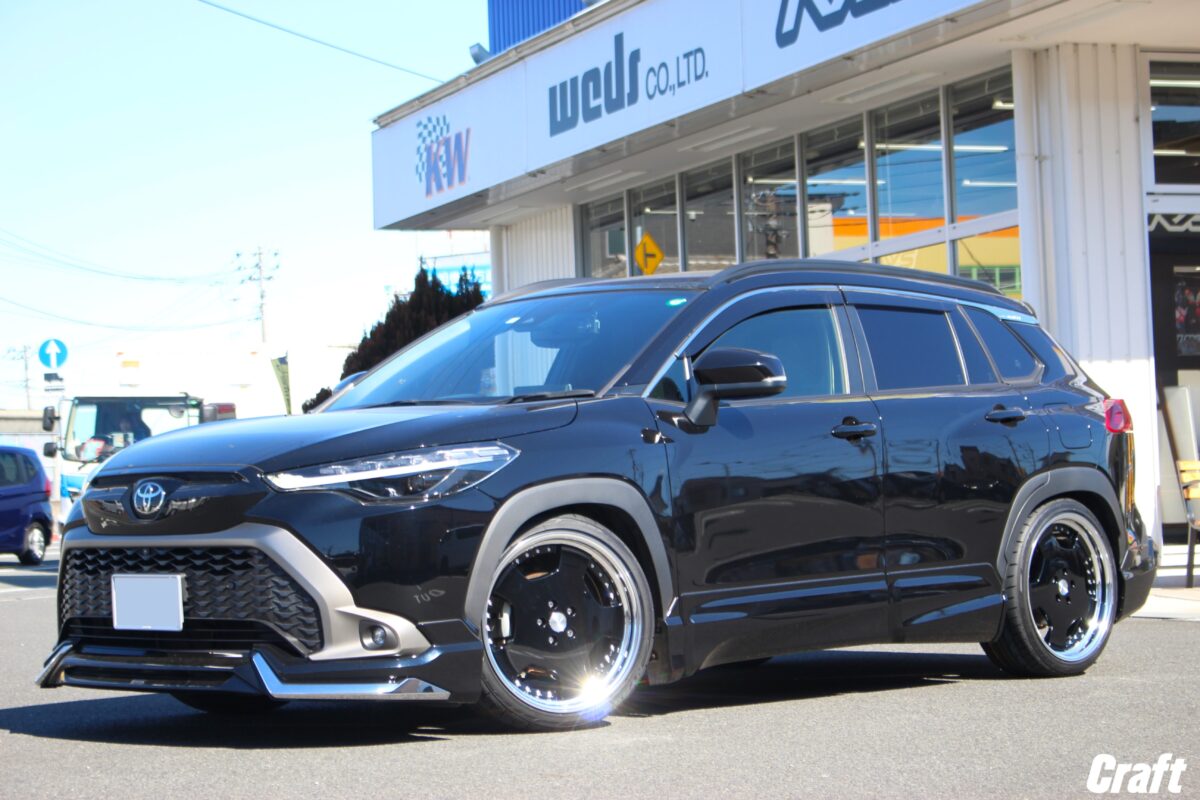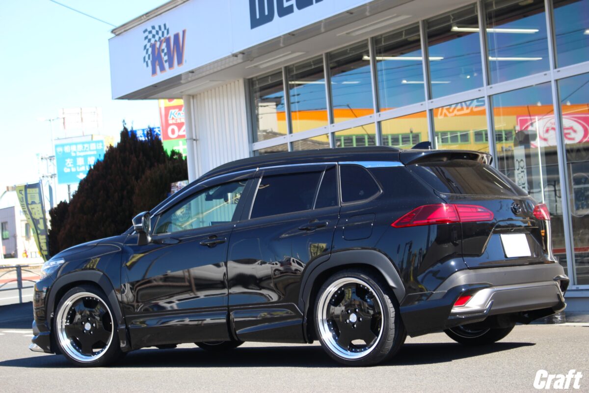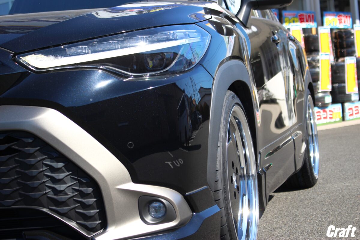 カローラクロスのツライチカスタム。 車高調でローダウンを行い 「 9.5J 20インチ 」 を装着っ✨