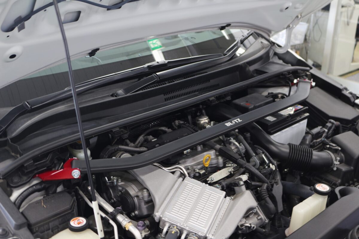 更に走行性能を上げる為にブリッツのストラットタワーバーもお取り付け↑↑お客様の愛車のフロント部分を補強し