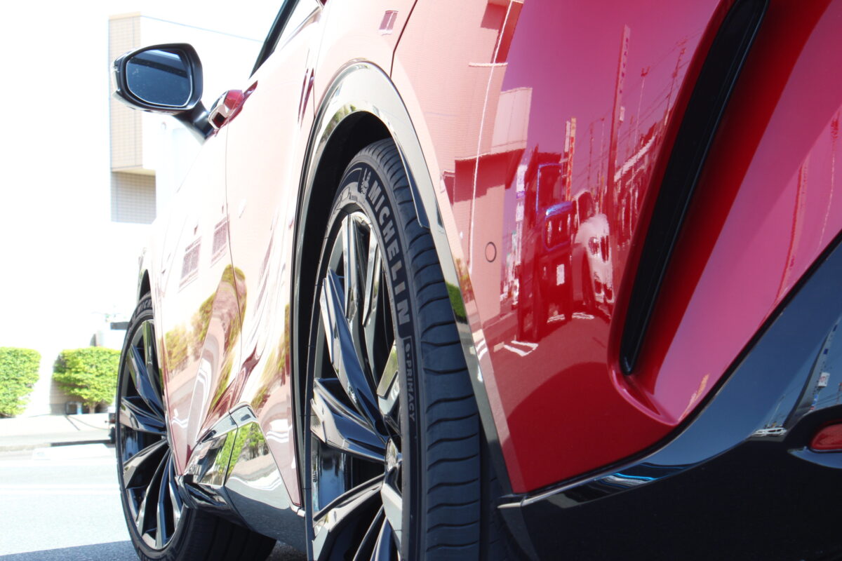 フロント7mm、リヤ14mmの設定で純正ホイールとの組み合わせでほぼツライチとなります。