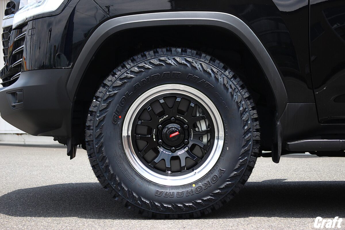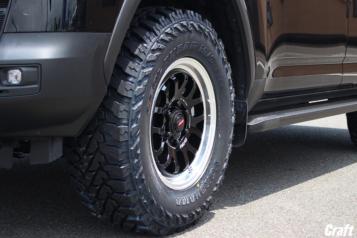 ホイールに組み合わせたタイヤは見た目の迫力がすごい「ヨコハマ ジオランダーMT G003」となります!
