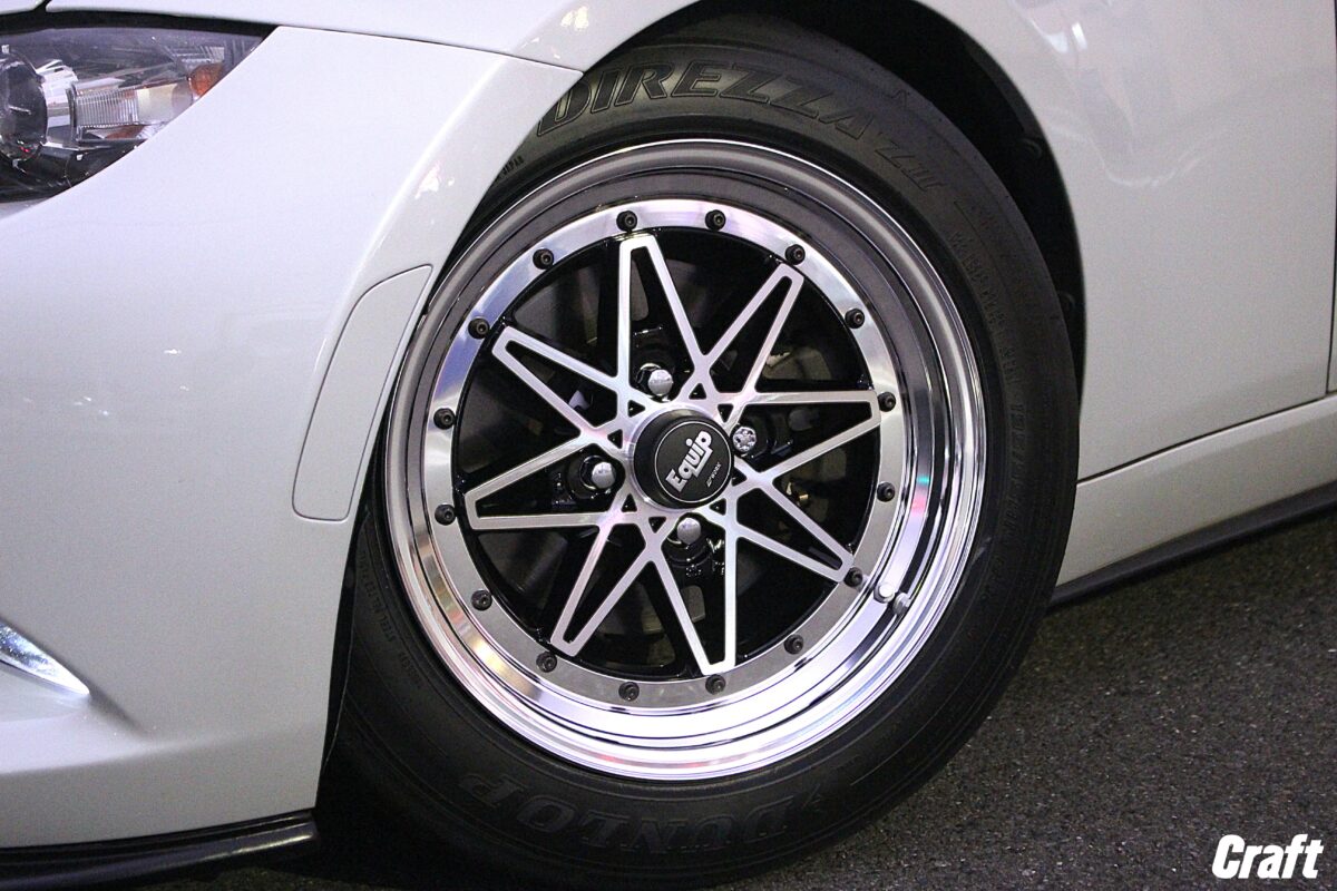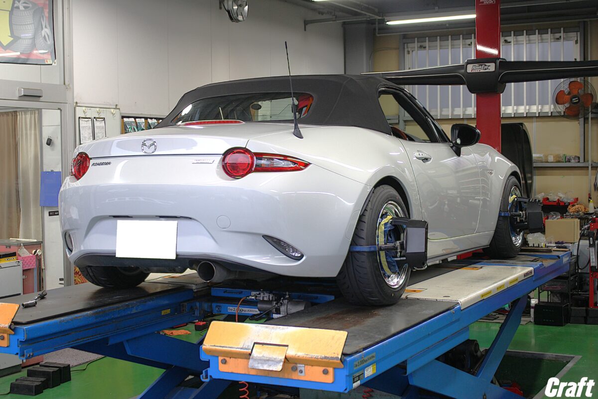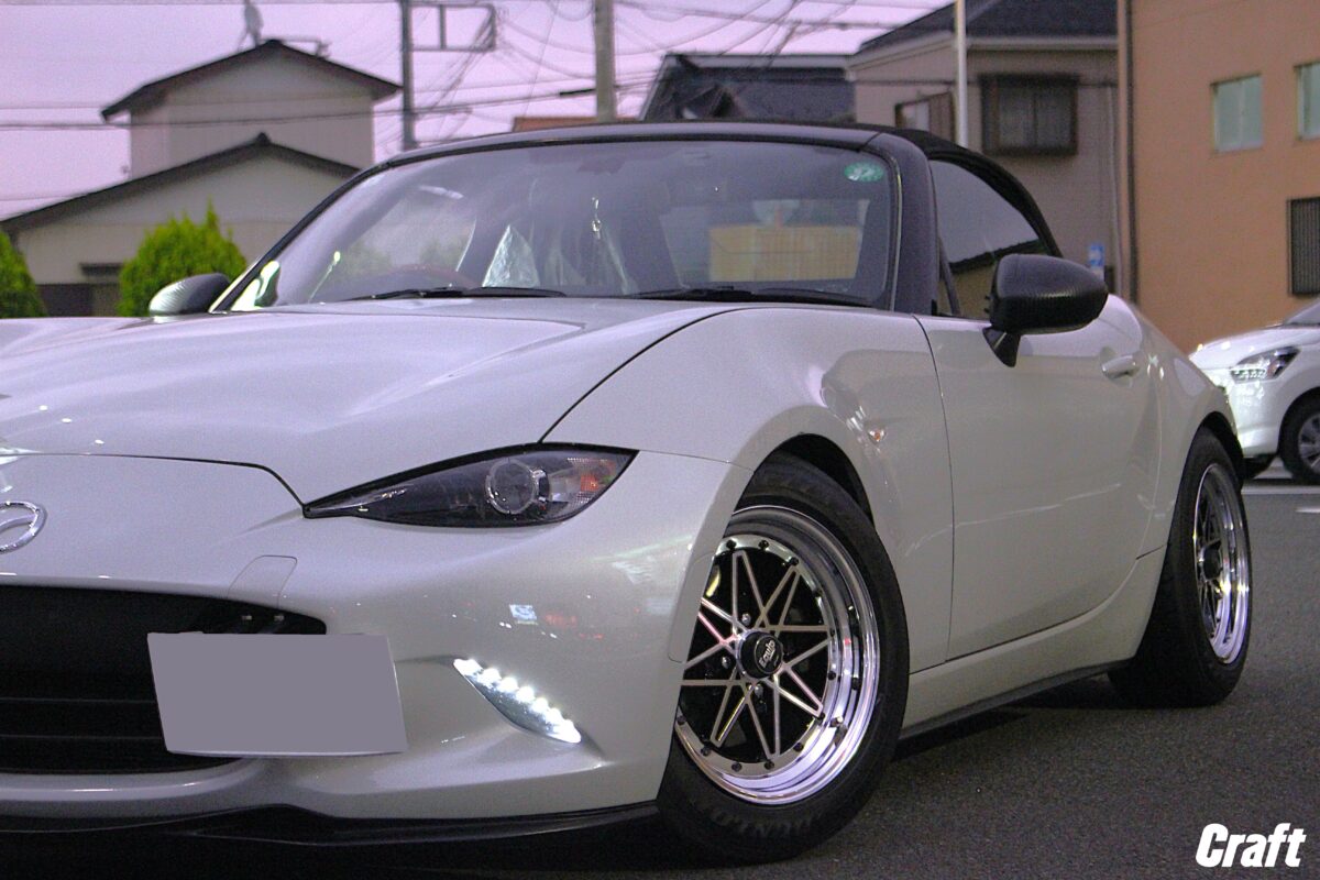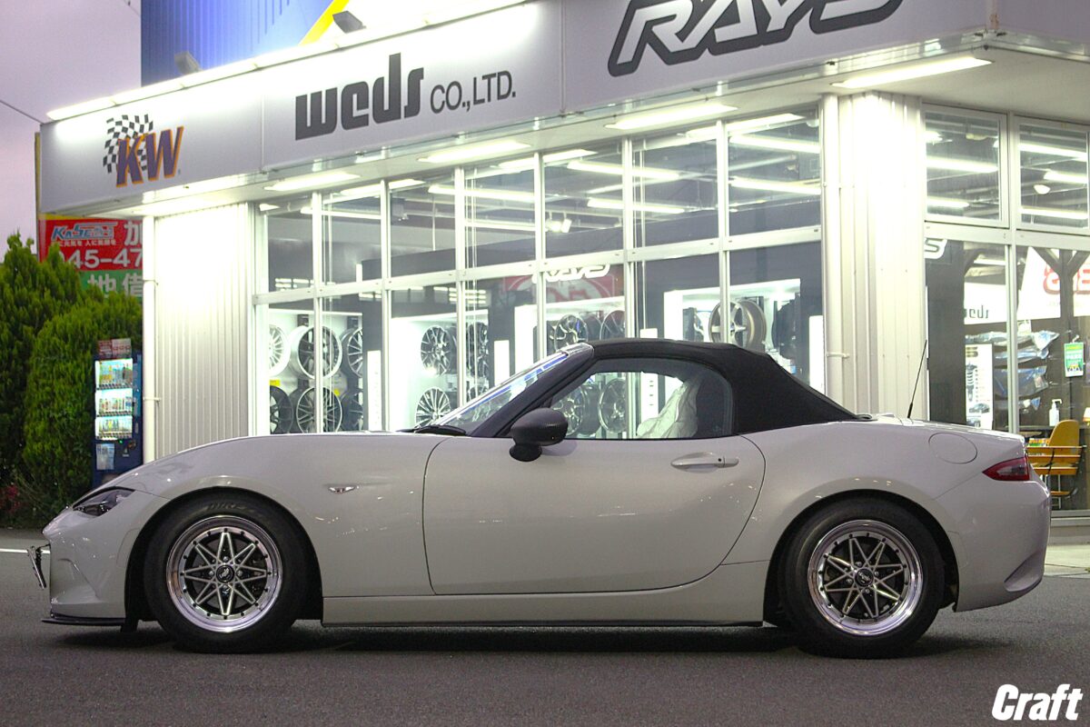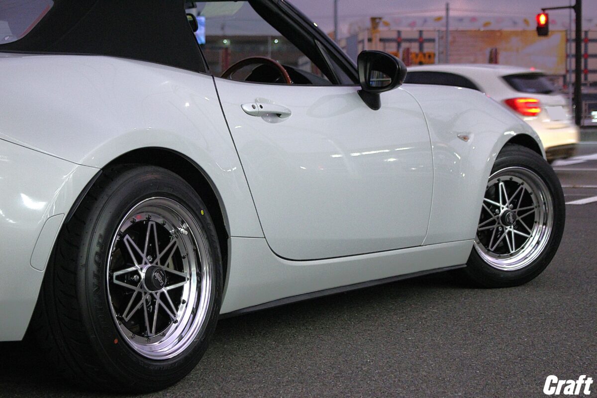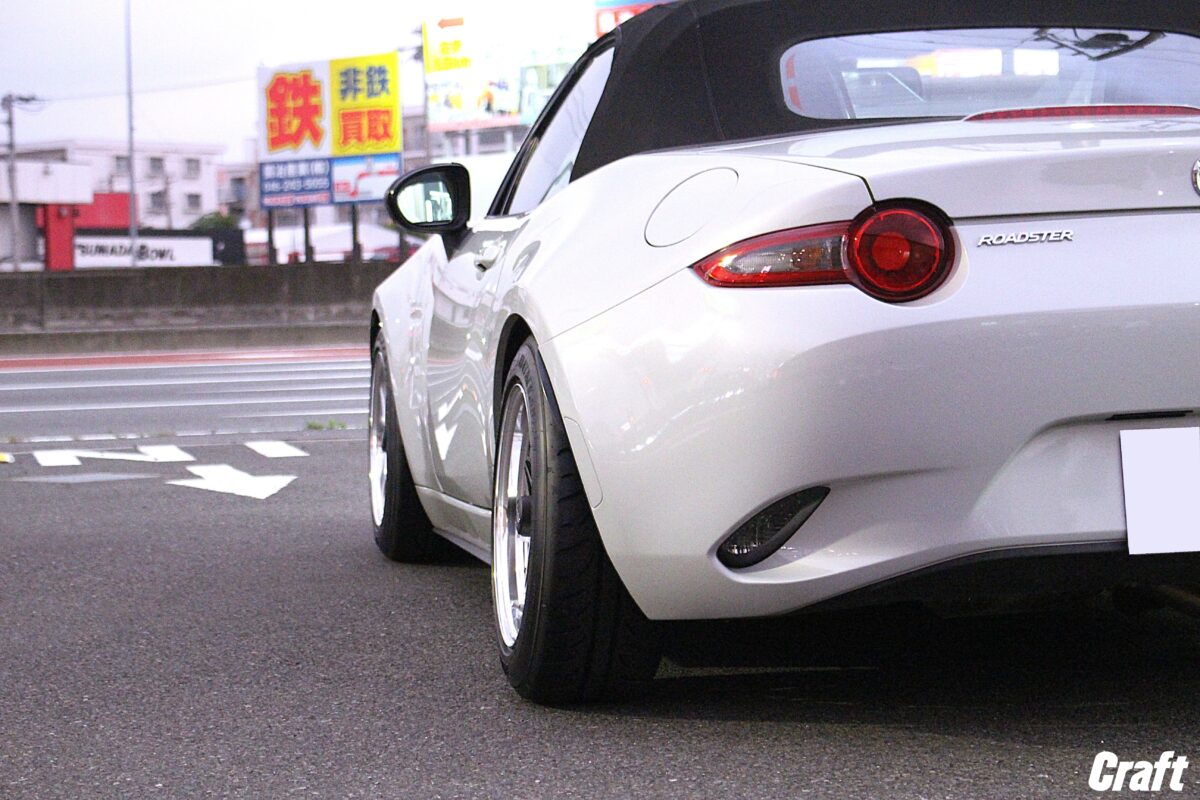 今回のおクルマはNDロードスター。キャンバーの調整が出来るクルマになるので、通常突出してしまうサイズでもアライメント調整でキャンバーを寝かせつつ調整すればちょうどいい出ヅラに仕上げることが出来ます!