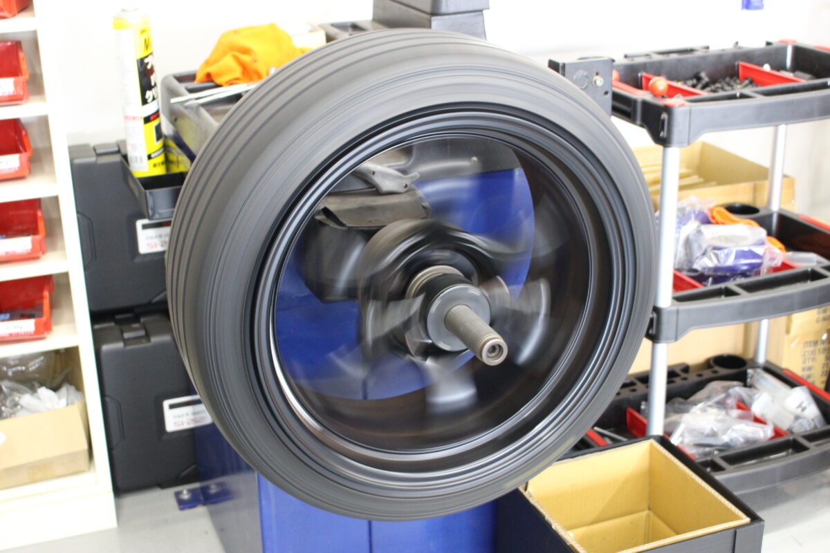 タイヤとホイールの重量差を調整しハンドルブレを防ぐ大切な作業です。