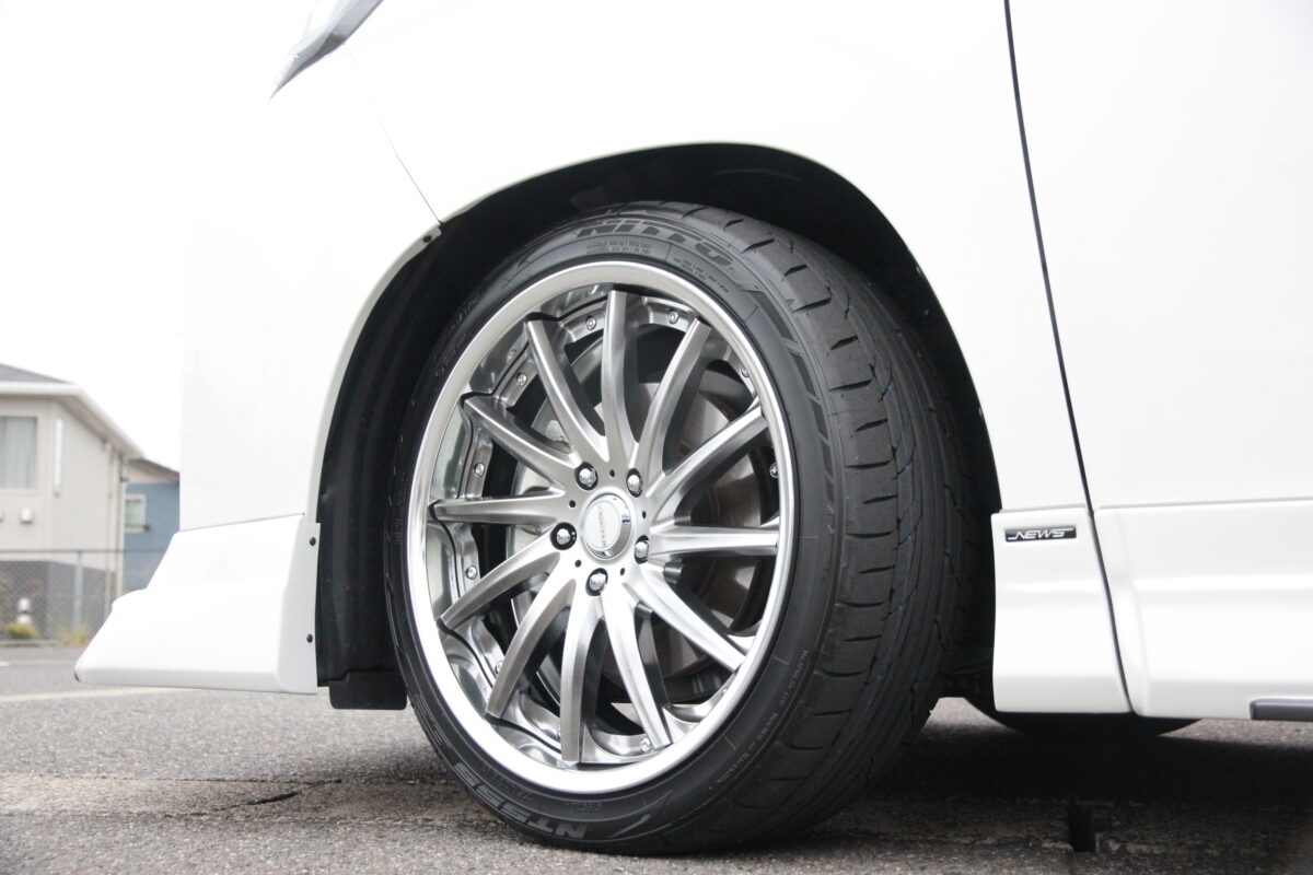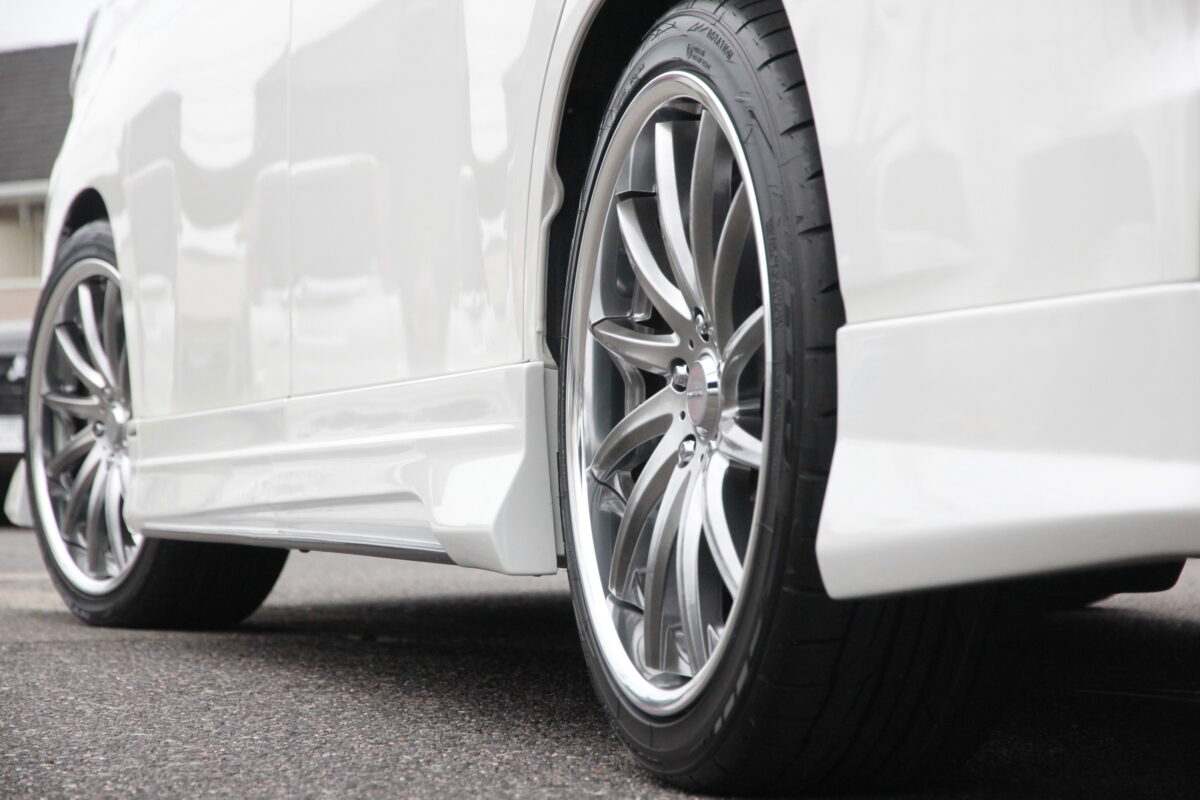 純正より1インチアップ+プレミアムシルバーのホイールで華やかな雰囲気になりました!!ローダウン量も最低地上高を確保した指2本分ほどのローダウン!