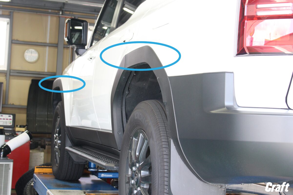 ランクル250は上の画像で〇印をつけているパーツと、タイヤ・ホイールのクリアランスがとても少ないおクルマ。
