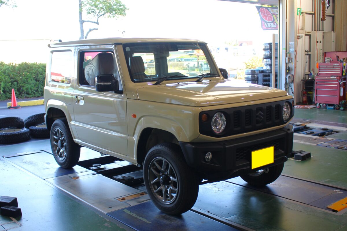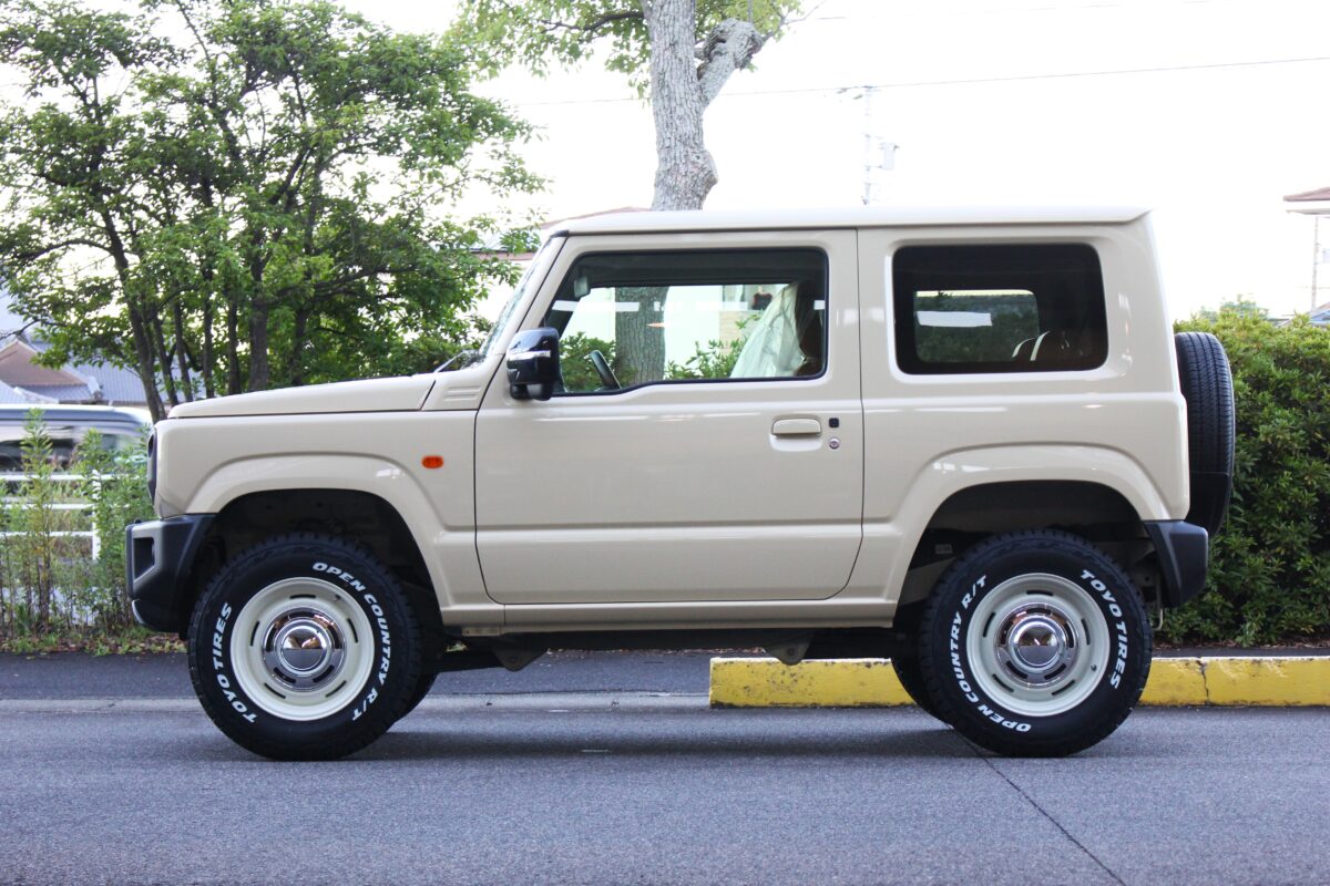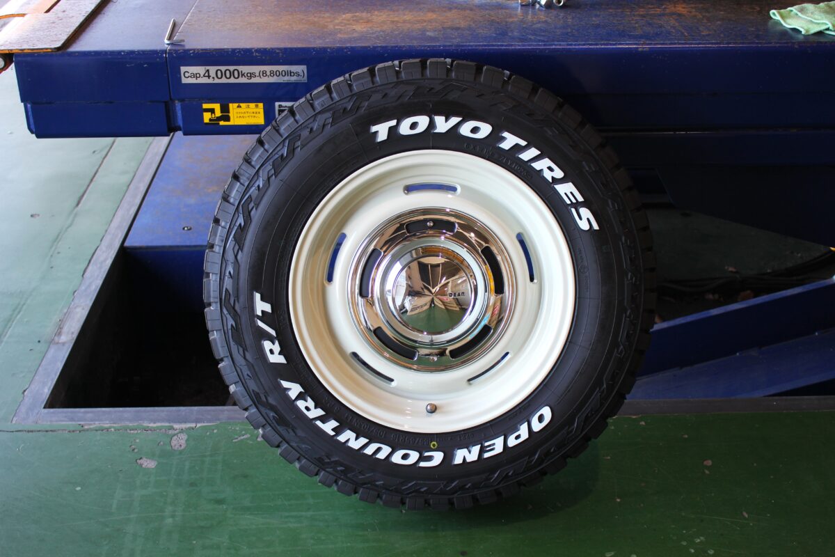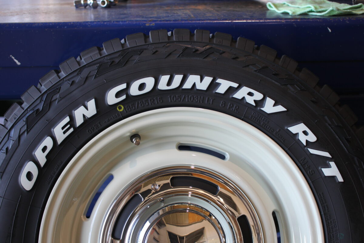 ブロックタイヤでジムニーのオフ感を出しつつ、ホワイトレターでレトロチックに味付けしていきます!