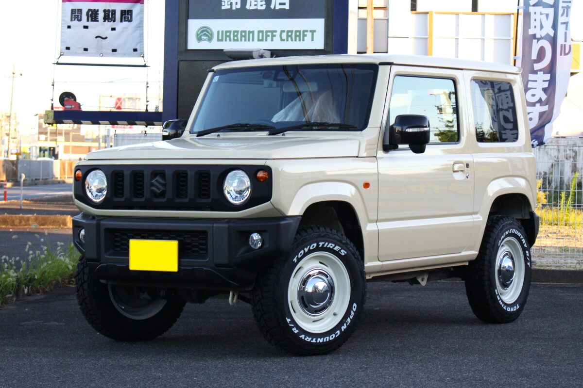 ■四角いジムニーにクラシックスタイルが似合う。DEANクロスカントリーとオプカンRTをセット。 空気抵抗等を鑑み流線形のボディデザインが主流になりつつある新車市場。 四角いボディデザインを採用するジムニーは、目新しく映り可愛らしい印象さえあります。 そこにレトロな雰囲気を組み合わせれば、よりファニーに。クルマのキャラを最大限に引き出せるハズ。 こんにちは。安藤です。 シフォンアイボリーメタリックのボディカラーは、レトロな雰囲気を目指すにも最適。 実際、当店で作業させていただくジムニーのTOP3に入る人気カラー。 ホワイトレターとの相性も良いですし、ホイールカラーも問いにくい。とまさにイイトコドリなのです。 スチールホイールを彷彿とさせる丸みを帯びた姿に惹かれてしまう? "クリムソン ディーンクロスカントリー"はまさにレトロ系を狙うなら間違いがない一本。 ホワイトレタータイヤとの相性もバツグン。オフ系タイヤをセットすることで、悪路走破性も向上することから 見ため、走り共にアップデートできるんですよね。 付属されるセンターオーナメントは脱着可能なため、 レス仕様で無骨さを楽しむこともできれば、オン仕様でレトロな雰囲気を楽しむこともできます。 2WAY。ビス固定式なので、気分に応じてアソんでみるのもいいのではないでしょうか? ※作業中の一コマ。 フロント:クリムソン ディーンクロスカントリー 16インチ リア:JB64 ジムニー純正16インチ 2x5スポークの純正ホイールから180°方向性を変えた新仕様。 4本交換後、全貌公開です! WHEEL:クリムソン ディーンクロスカントリー 16インチ COLOR:マットブラック TIRE:トーヨータイヤ オープンカントリーR/T 装着車種を想定した設計故にリム深度も十分。 また、組み合わせたオープンカントリーR/Tのホワイトレターサイズは、少し大きめな印象。 足元に視線が集まりやすく足元メイク時の印象変化も大きいですネ。 組み合わせたオープンカントリーR/Tは、A/T・M/Tそれぞれの長所を併せ持ったハイブリッドテレーン。 オン/オフの走行性も確保しつつL字連結ブロックも手伝って、パターンのカッコよさも魅力の一つ。 ジムニーオーナー様からのご指名が多いのも無理はない!? 【side view / BEFORE】 【side view / AFTER】 同インチながらタイヤサイズ見直しとホイール変更からくる変貌ぶりは一目瞭然。 四角いボディのジムニーのキャラ特性も最大限に引き出せていますネ。 この度はありがとうございました。 また、増し締めや空気圧点検等でもお待ちしております。 それでは素敵な4x4ライフを! アーバンオフクラフト鈴鹿店でした。