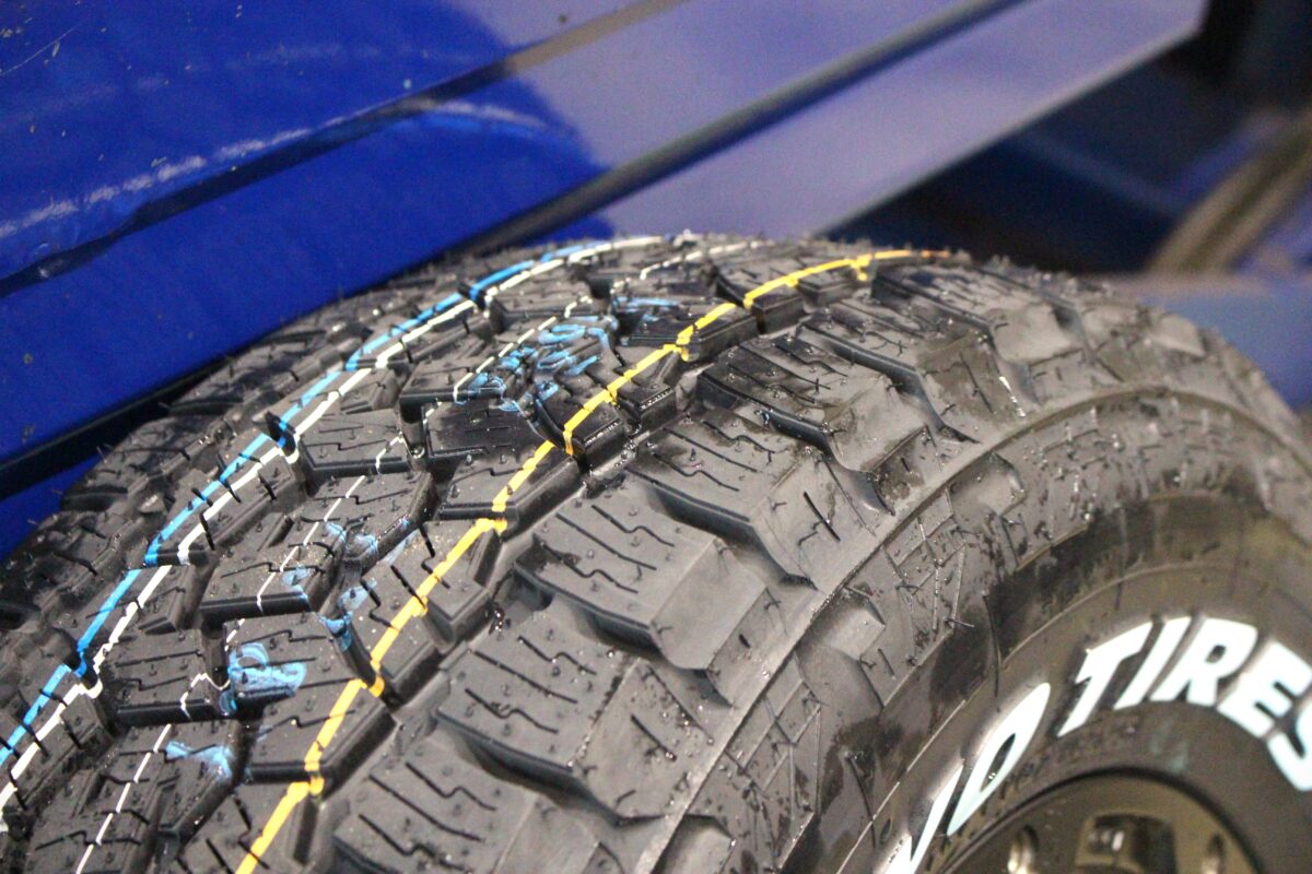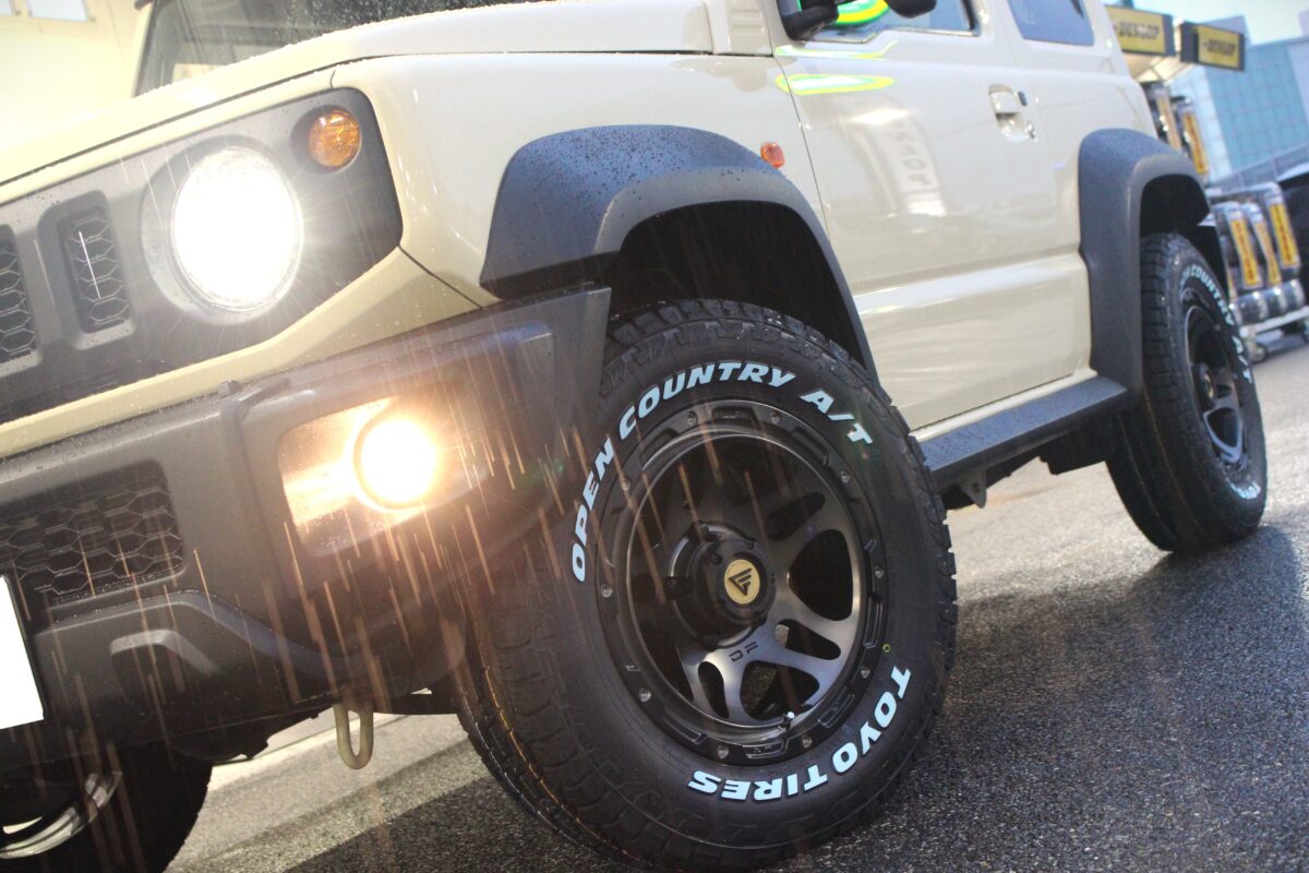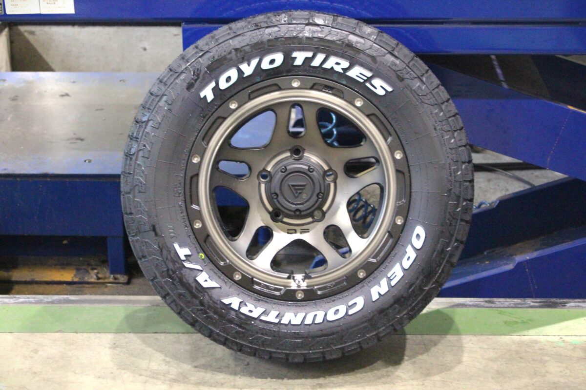 タイヤはトーヨーのオールテレーンタイヤ、オープンカントリーAT3を組み合わせます。くっきりとしたホワイトレターが人気で指名買いされるオーナー様も数多く。