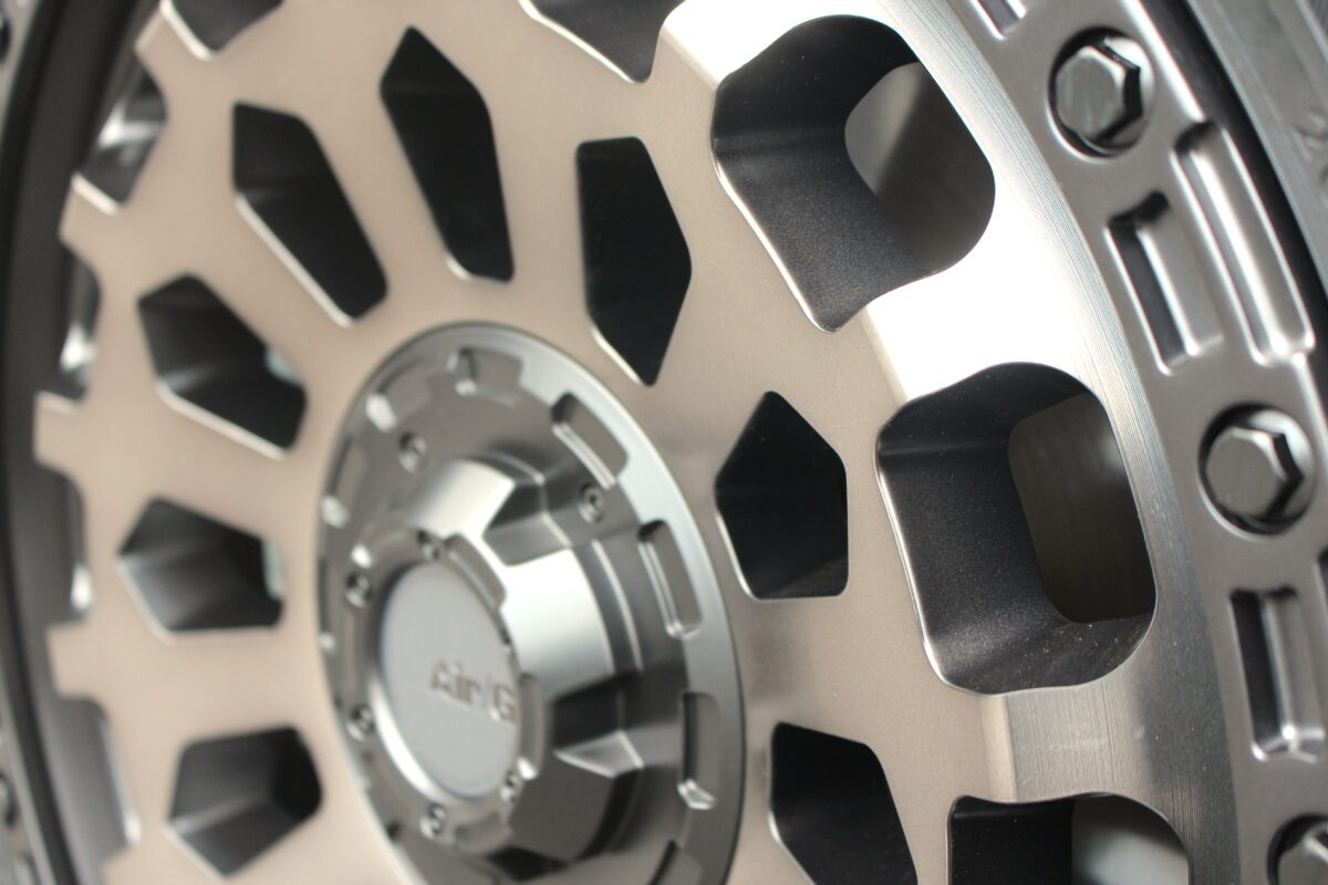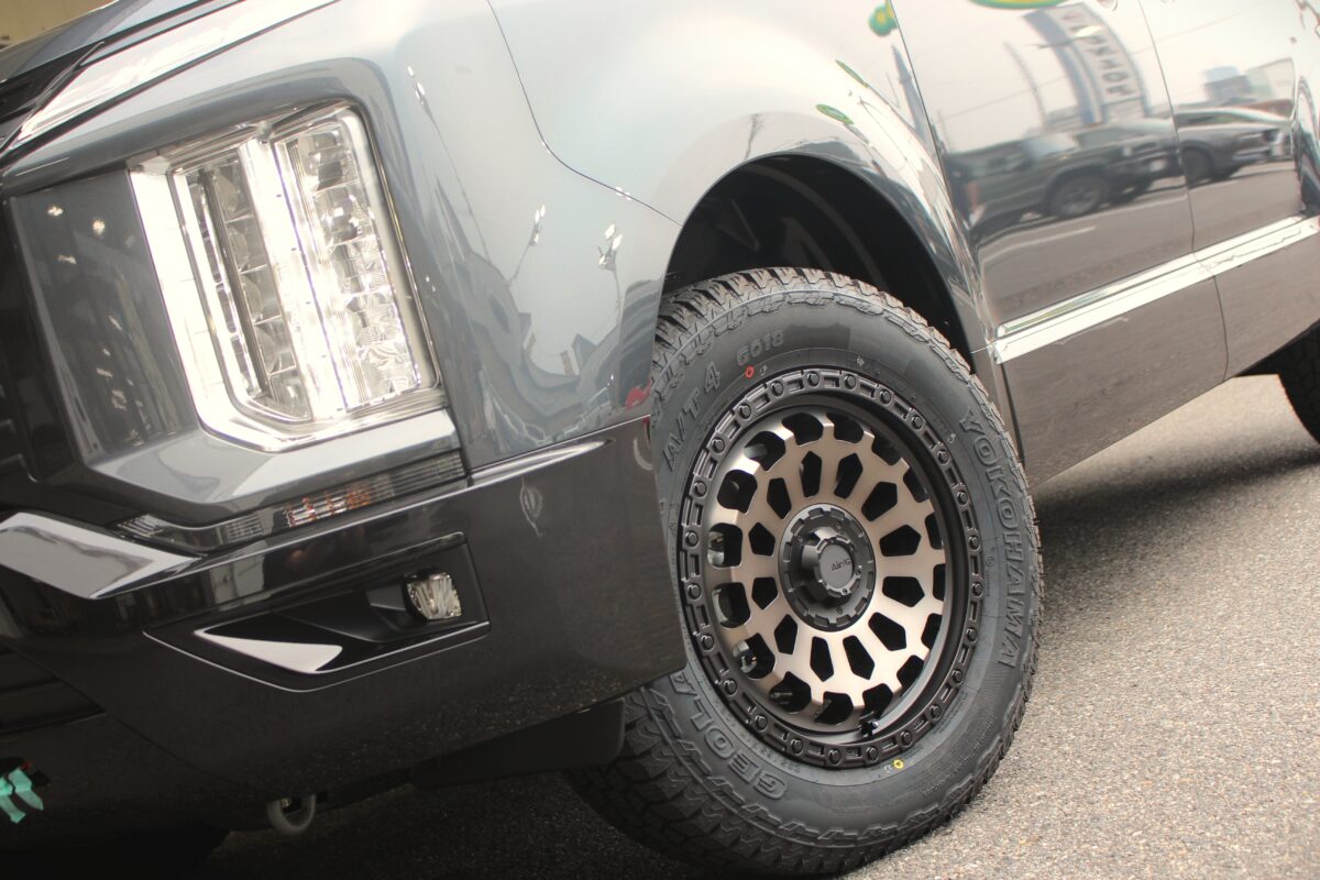 老舗ヨンクメーカー4×4エンジニアリングサービスの手掛けるAir/G ヴァルカンを装着します。リム全周にピアスボルト風のギミックをこらし、メッシュデザインと組み合わせることでオフロード感を演出します。