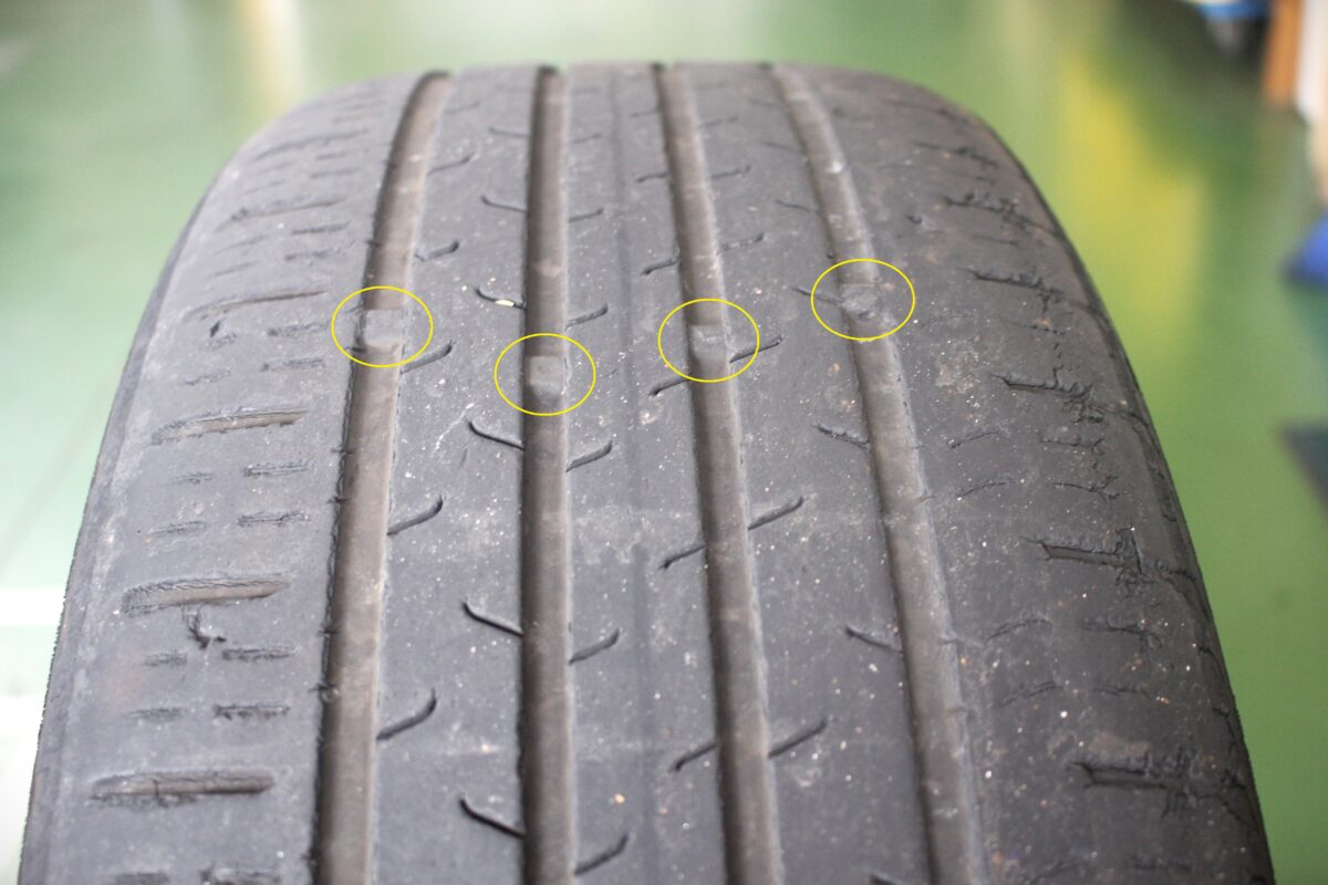 溝の残りが1.6mmに達したときに現れる”スリップサイン”名前の通りコレが出るとスリップしやすくなります💦
