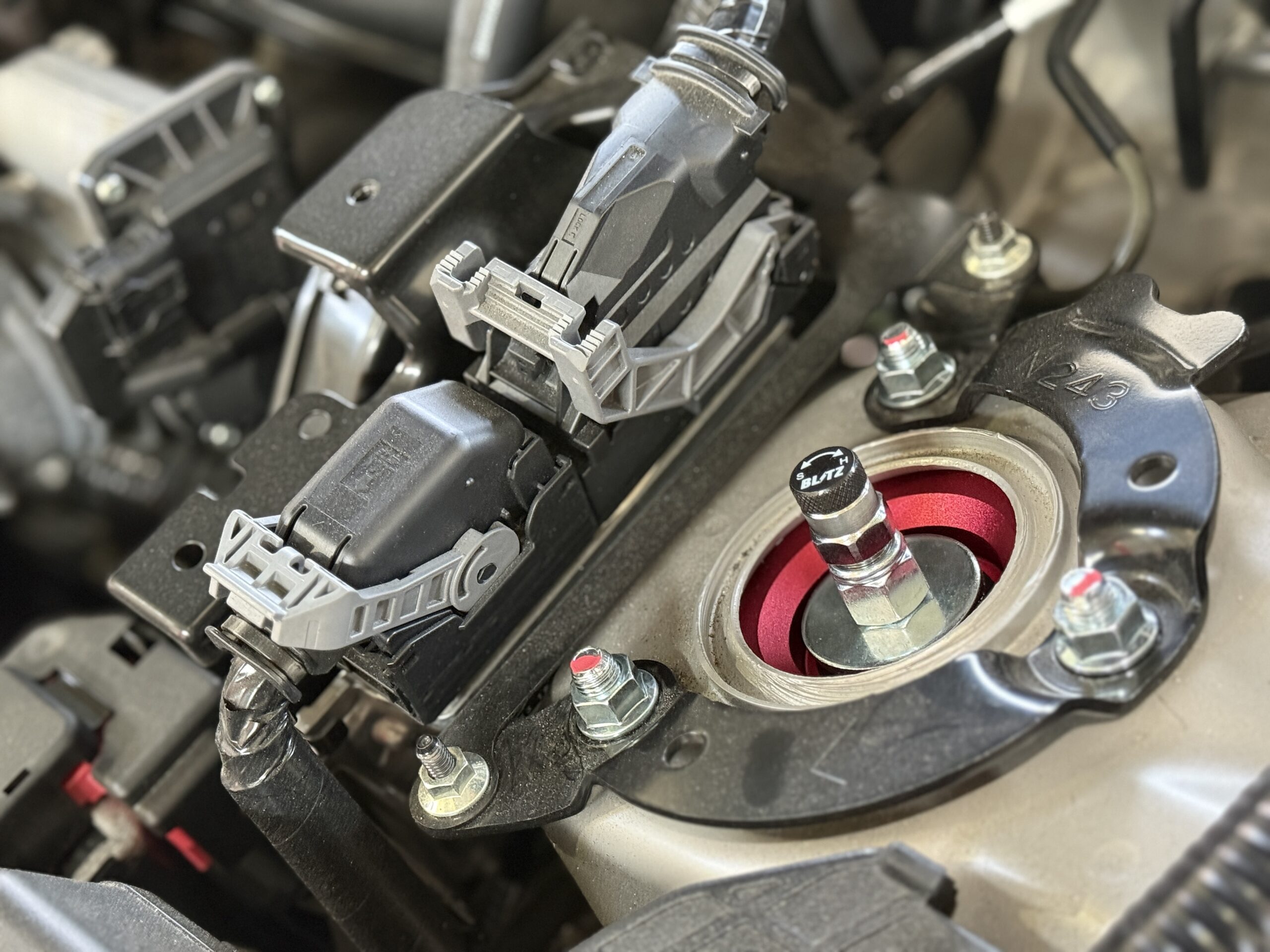 フロントの「減衰力調整」ダイヤルは、ボンネットを開けて、アッパーマウントのトップにあります。