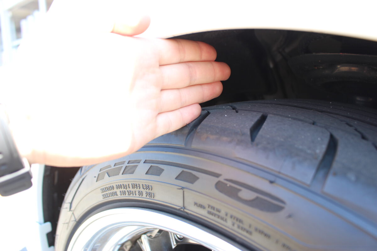 車高の下がり具合としては、現在で指3~4本分。ダウンサスでローダウンをしてもこれだけフェンダーの隙間が空いているので、もう少し下げたいところではありますね。