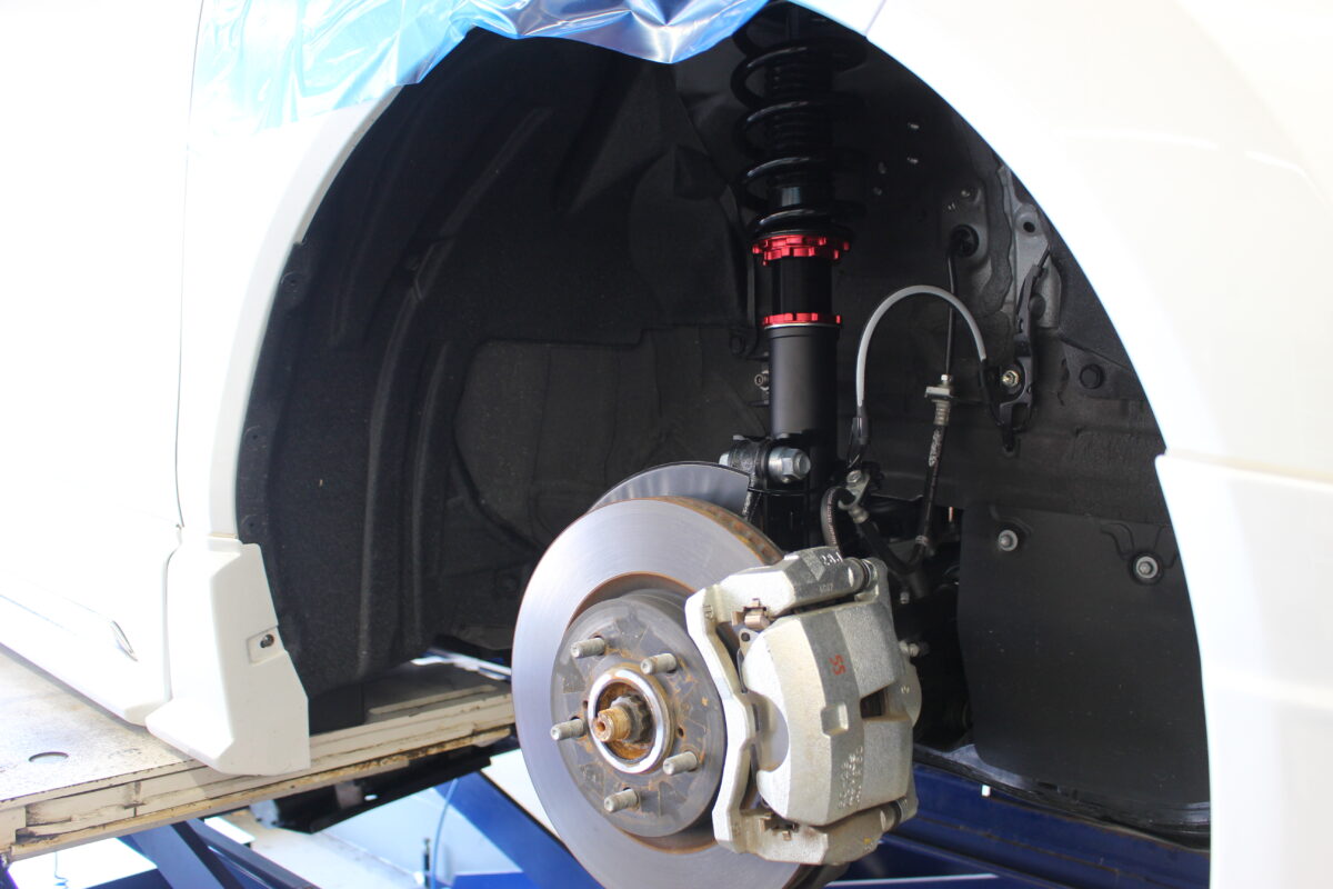 ホイールセットを履くとどうしても足回りは見えにくいですが、施工中の風景はこんな感じです。車高調をインストールすると内側からも外側からも「変わっている」という感覚がはっきり分かりますし、大きいホイールを履きたい場合は選択の幅を広げるために検討いただくと良いかと思います^^