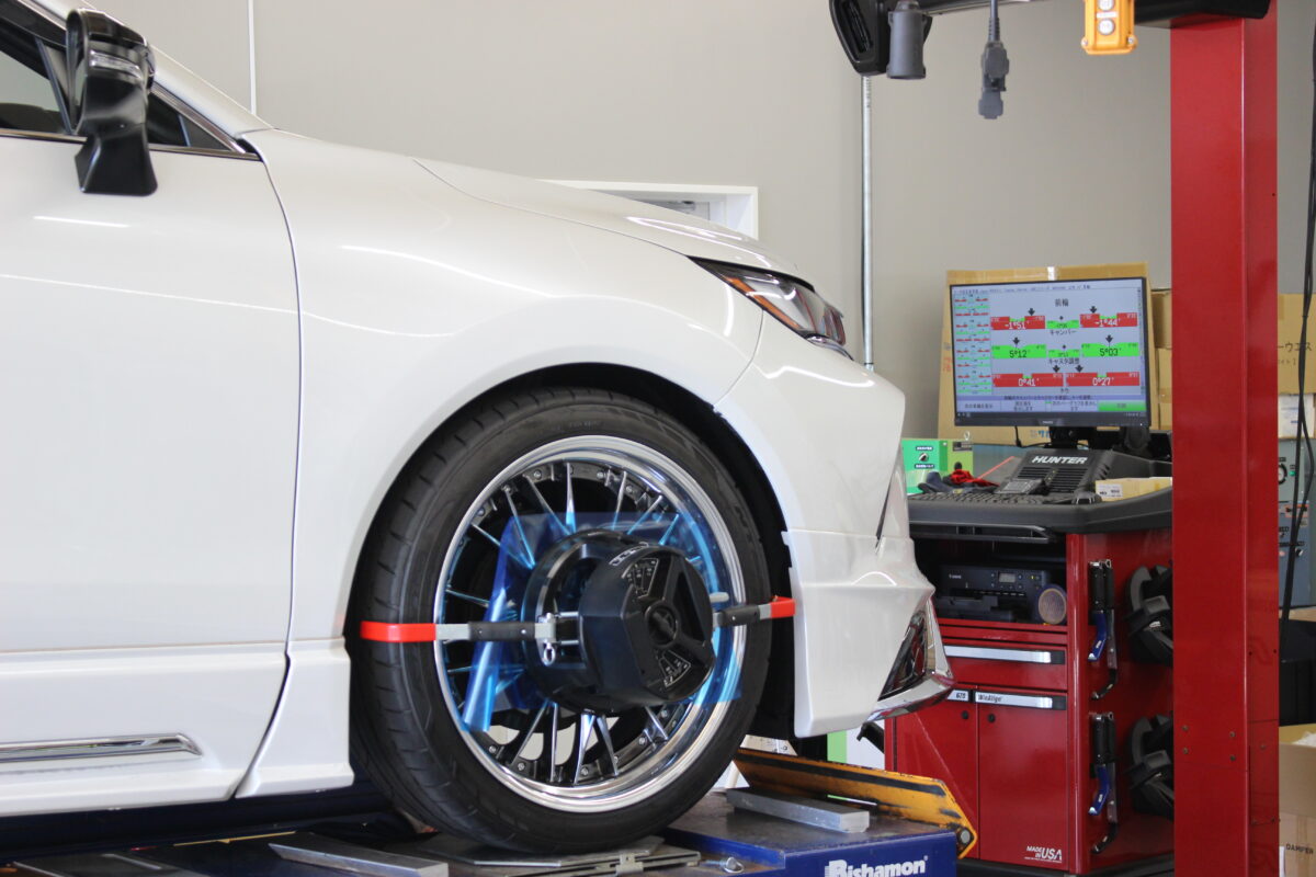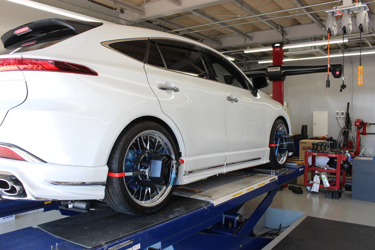 社外の足回りにするとアライメントが狂ってしまい、ハンドルがまっすぐなのに左右どちらかによってしまうなどの問題が出てくる可能性があるため、アライメントの調整をして確認していきます。