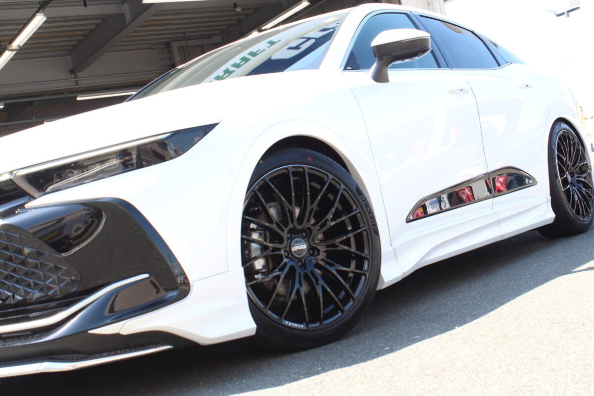 クラウンアスリートにHOMURA2×5TW 20インチを装着!! 9.5J=FACE2で仕上げますっ☆☆     皆様こんにちは、クラフト厚木店・佐藤で~す♪♪   本日のご紹介はM様・クラウンアスリート!!     車高調でローダウン済みのお車!!   そしてすでに20インチへとインチアップを行っていましたがこの度仕様となりま~す☆☆   それではコチラをご覧下さい。     HOMURA2×5TW 20インチ。   2×5TWは現在15種類あるHOMURAシリーズの中でも限られた軽量モデル!!   鋳造ホイールでありながら鍛造ホイールのリム成形と同じタイプの製法で作られているアイテム☆☆   大口径になればなる程、重量や剛性が気になるのでこう言ったアイテムは重宝します!!     そしてリム幅は2種類から選べますがよりカスタム性の強い 「 9.5J 」 をチョイス!!   9.5Jになるとコンケイブの効いたFACE2になる所も魅力的っ♪♪   これを聞いて皆様が疑問に思うこと。。。   それは 「 前後9.5J 」 なのかどうかですよね???     その答えは 「 YES 」   もちろん前後に9.5Jをインストールしていますよぉ~   通常ですと、8.5J&9.5Jのコンビネーションになるかと思いますが。。。   「 9.5J=FACE2 」 の方がカッコ良く仕上がりますからねっ!!笑   ですが、クラウンはインナー側にあまりゆとりがないので干渉には注意しましょうね!!     いかがでしょう??この迫力。。。   これを見たら9.5Jを選択したくなりませんか???笑   店頭にてオーナー様とお話をしている際、僕の頭の中では 「 こんな感じに仕上がるだろうなぁ。。」 とイメージが湧いているんですっ♪♪   せっかくの仕様変更と言う事もあったのでオーナー様には満足してもらいたい。。。   なのでオーナー様ととことん話をして仕上げる方向性をじっくり相談しました!!     そしてオーナー様からも◎をいただく事が出来ましたっ♪♪   愛車のドレスアップにはそれ相応の費用が掛かります、だからこそ絶対に失敗出来ないですよね??   失敗出来ない愛車のドレスアップ、クラフト厚木店にぜひご相談下さい!!     シンプルなデザインであるHOMURA2×5TW。   しかしながらスポーク面をよぉ~く見ると造形美溢れる良いデザインなんですっ!!   カラーは2種類設定されており、ツヤを抑えたカラー 「 BYJ ・セミグロスブラック 」で仕上げました♪♪   仕様変更大成功ですっ!!     M様、この度はご購入誠にありがとうございました!!   愛車のイメージがガラッと変わり見違えちゃいましたねっ☆☆   カスタムが大好きなご友人同士で楽しいカーライフをお送り下さいね!!   それではまたのご利用お待ちしておりま~す♪♪
