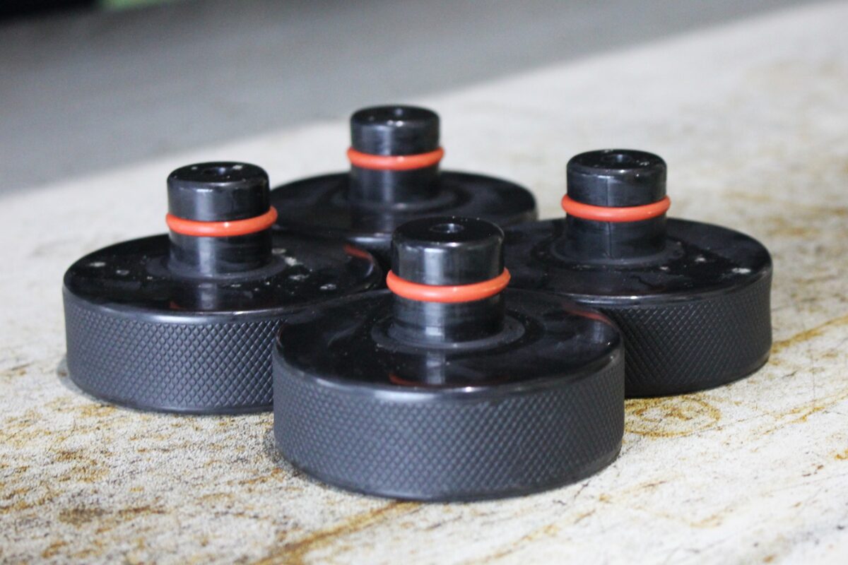 まずは、テスラのお約束「ジャッキアップパッド」を車にセットして車を持ち上げます。