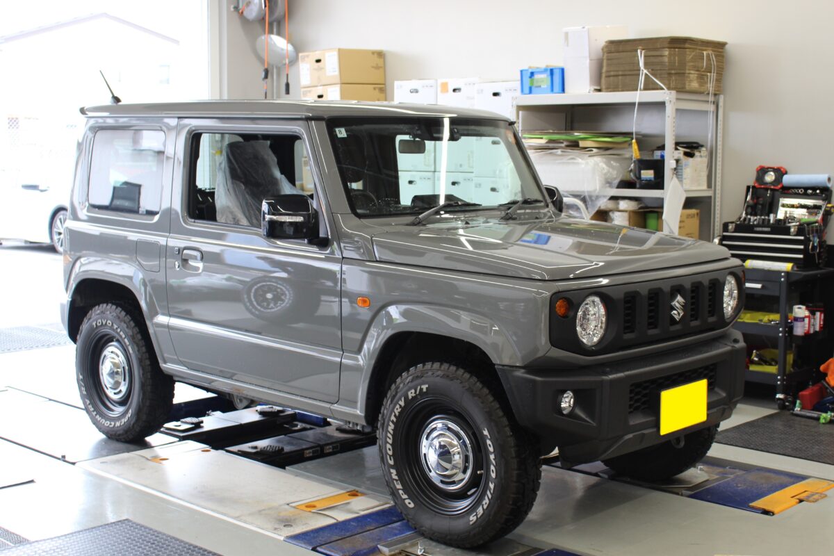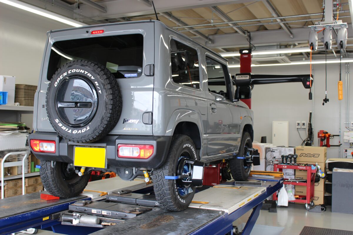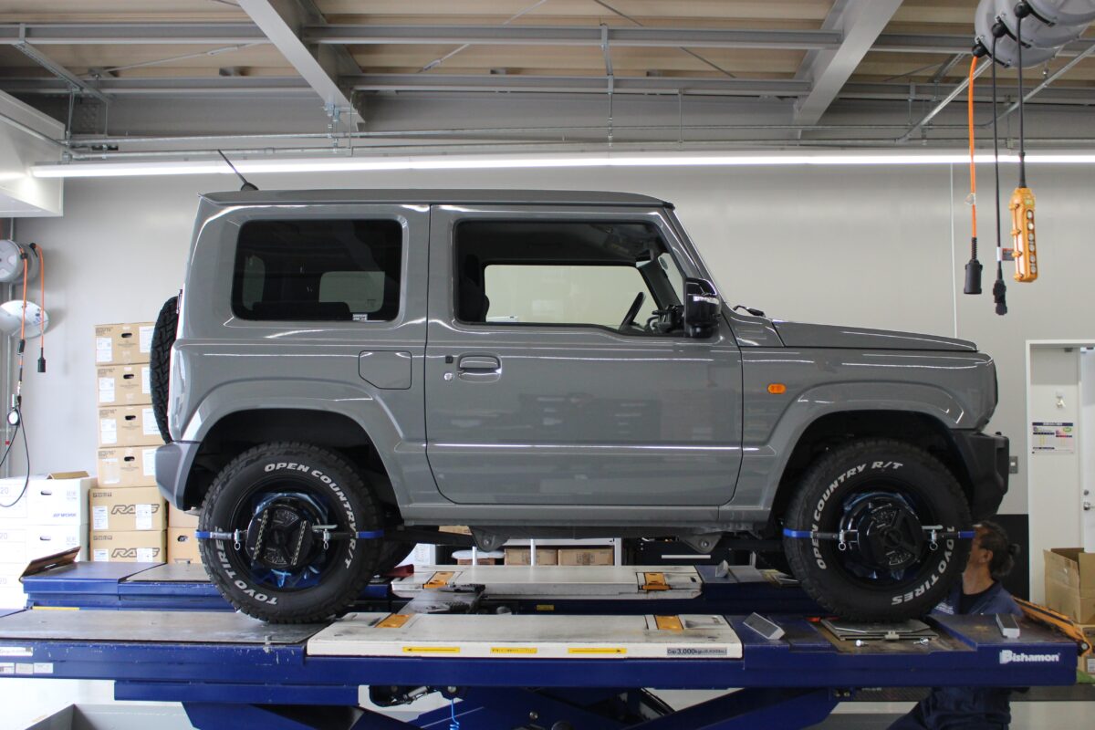 PITに入庫した今回のジムニーはタイヤ・ホイールはカスタム済でカッコいいですね!