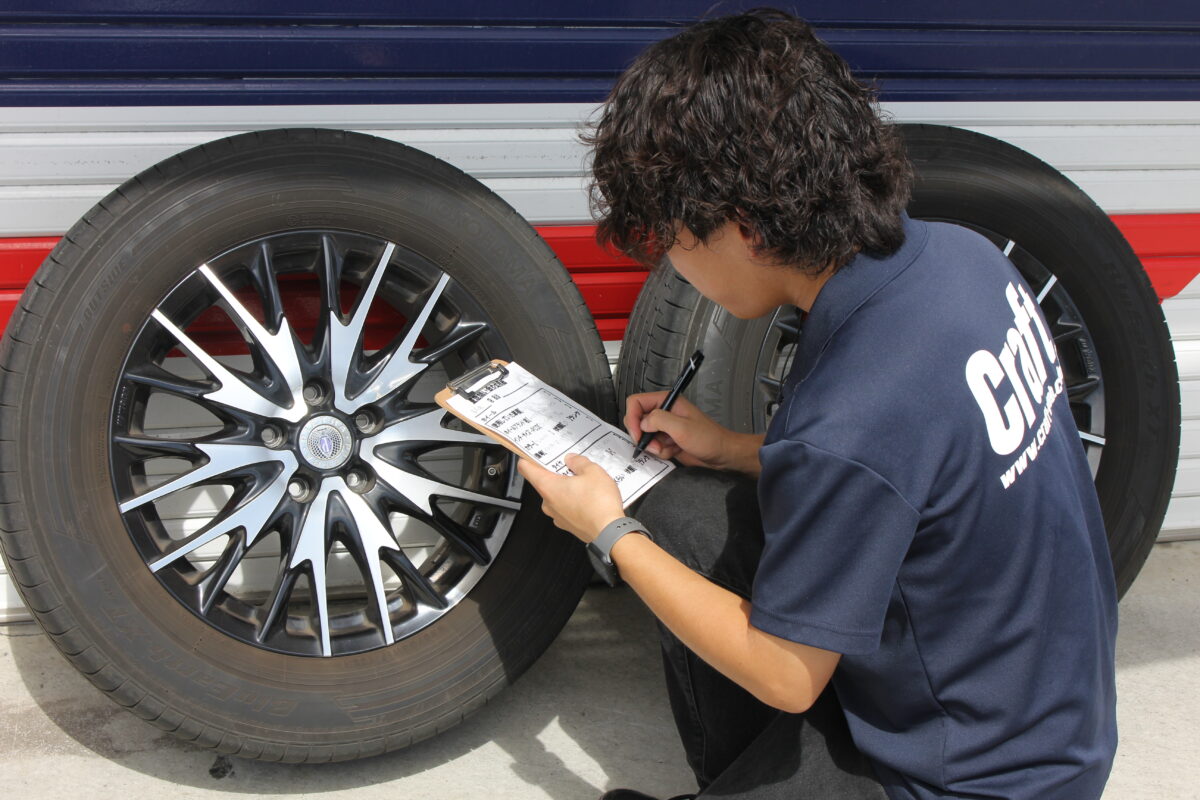 積み下ろし後、店舗スタッフがアルミホイールの状態を確認しながら細かいところまでチェック。