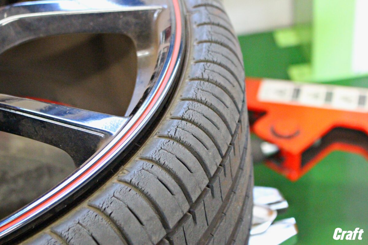 タイヤには多くのヒビが入っており、硬化(硬くなる)しているのが想像出来るのではないでしょうか!?