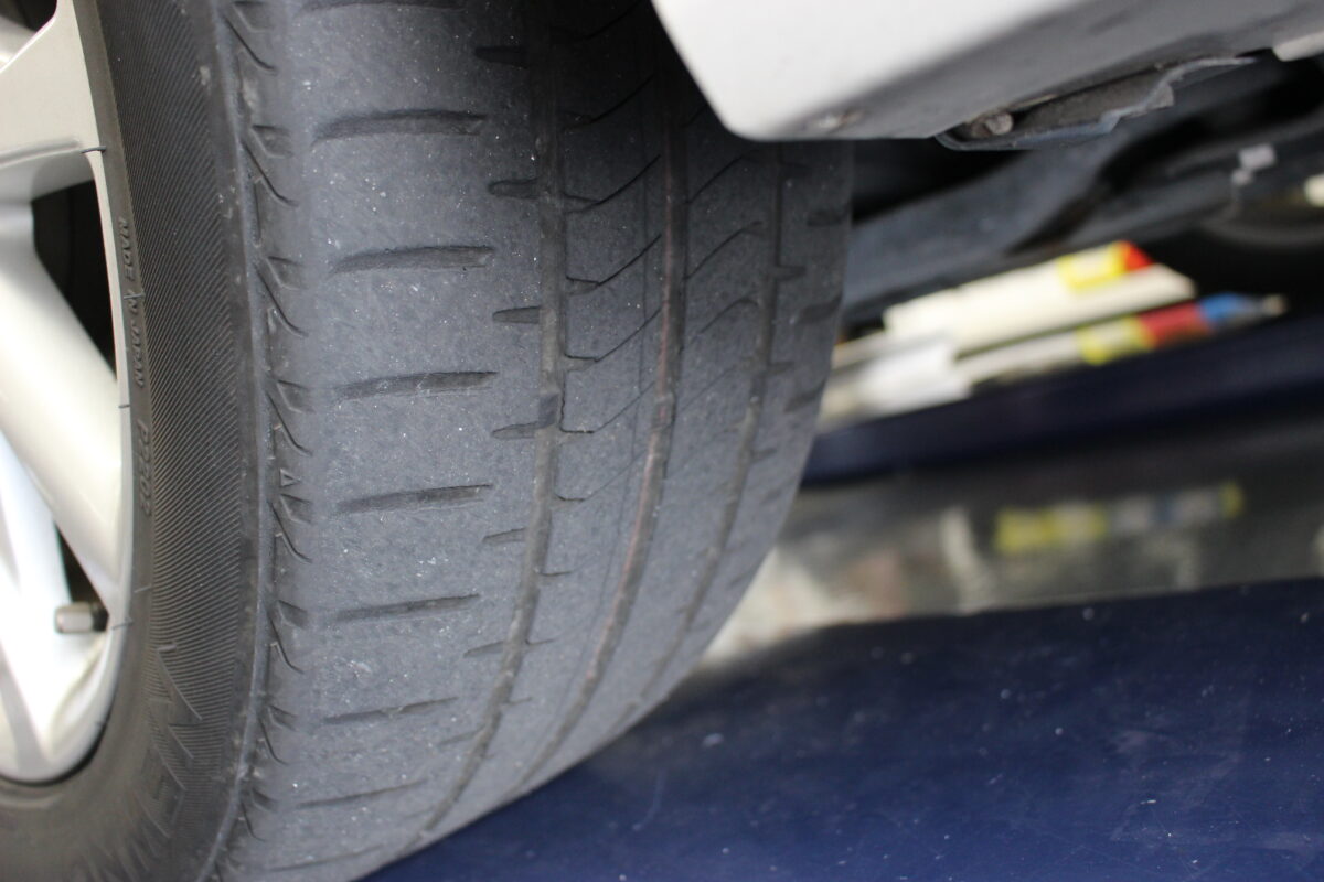 タイヤの溝が減っていると濡れた路面でのブレーキが効きにくくなりとても危険。