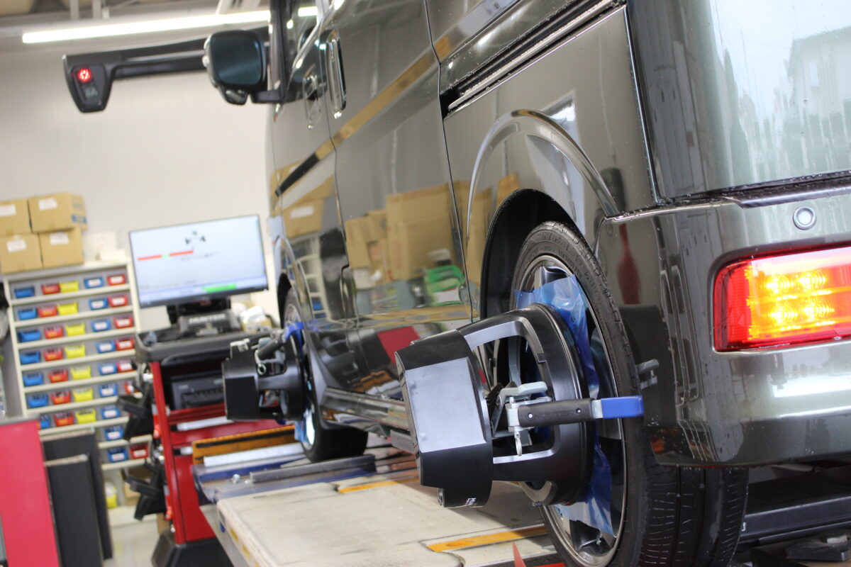 社外の足回り部品を入れるとセンターがずれて直進安定性が損なわれて片偏りなど起きる可能性がありますので、アライメント調整を行っていきます。